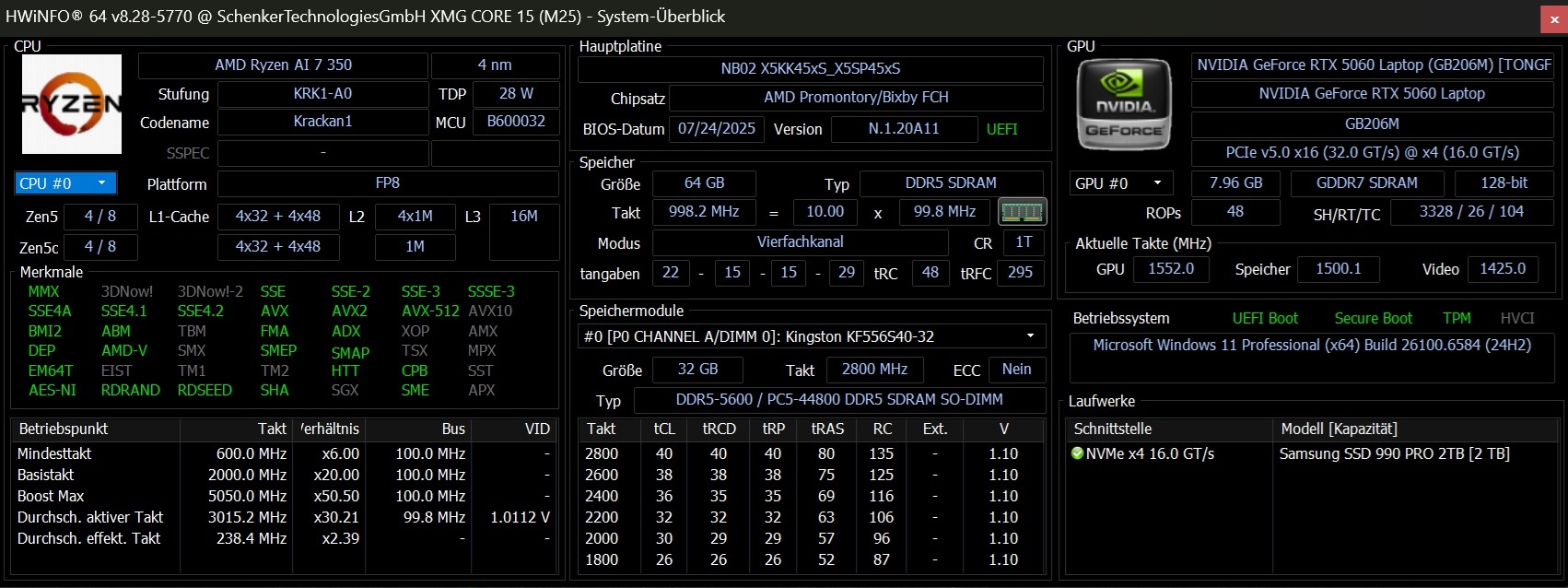 SCHENKER XMG Core 15 (M25) AMD Ryzen AI 7 350 ⎘ Nvidia GeForce RTX 5060 Laptop ⎘ 64 GB Memoria, 2048 GB SSD | Prezzo di listino: 1840 EUR | 1.9 kg | 22 mm | 15.30" 2560x1600 197 PPI IPS | |