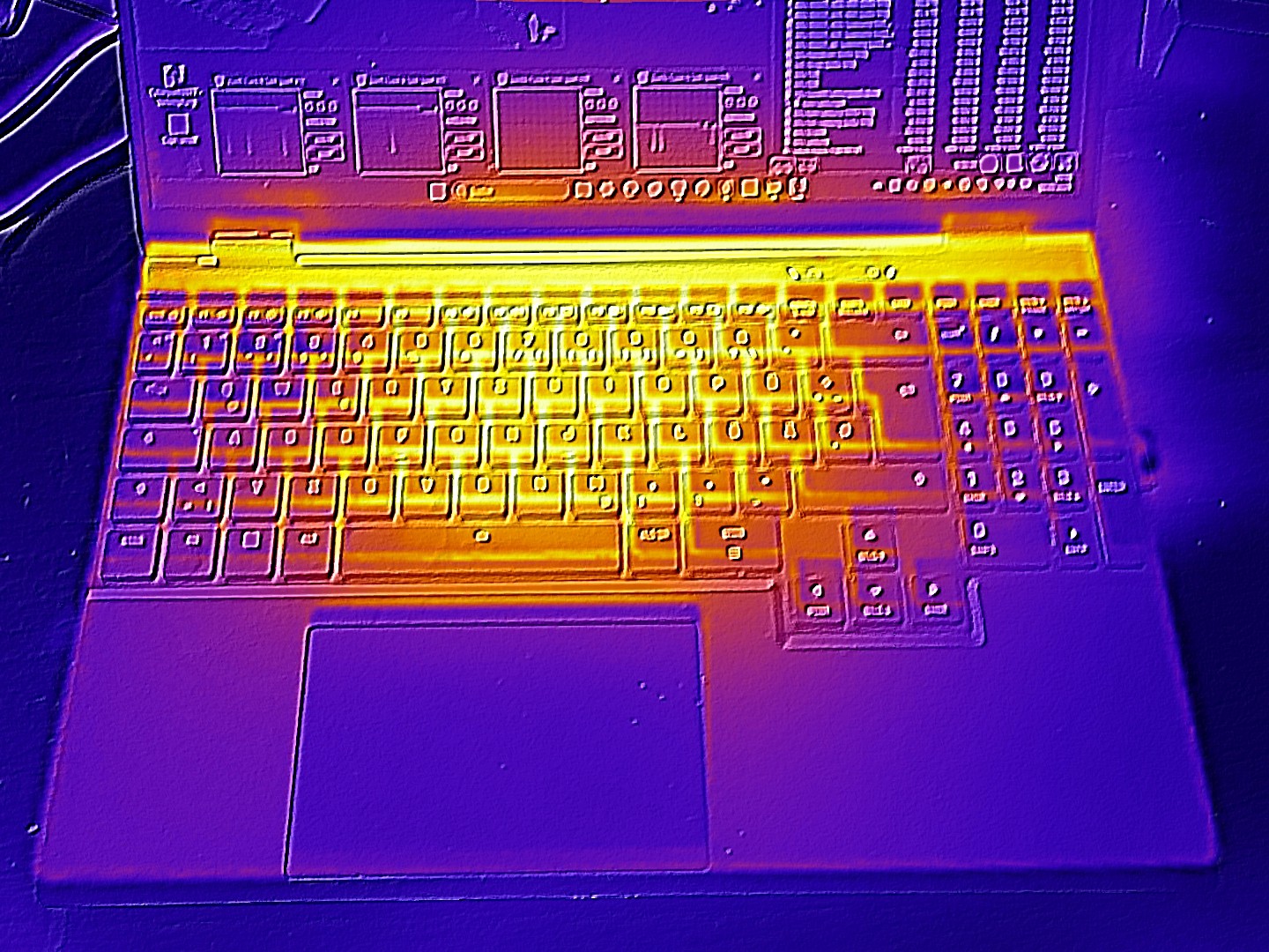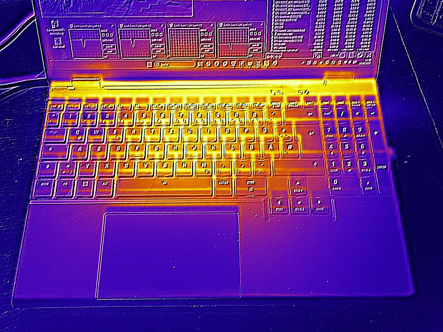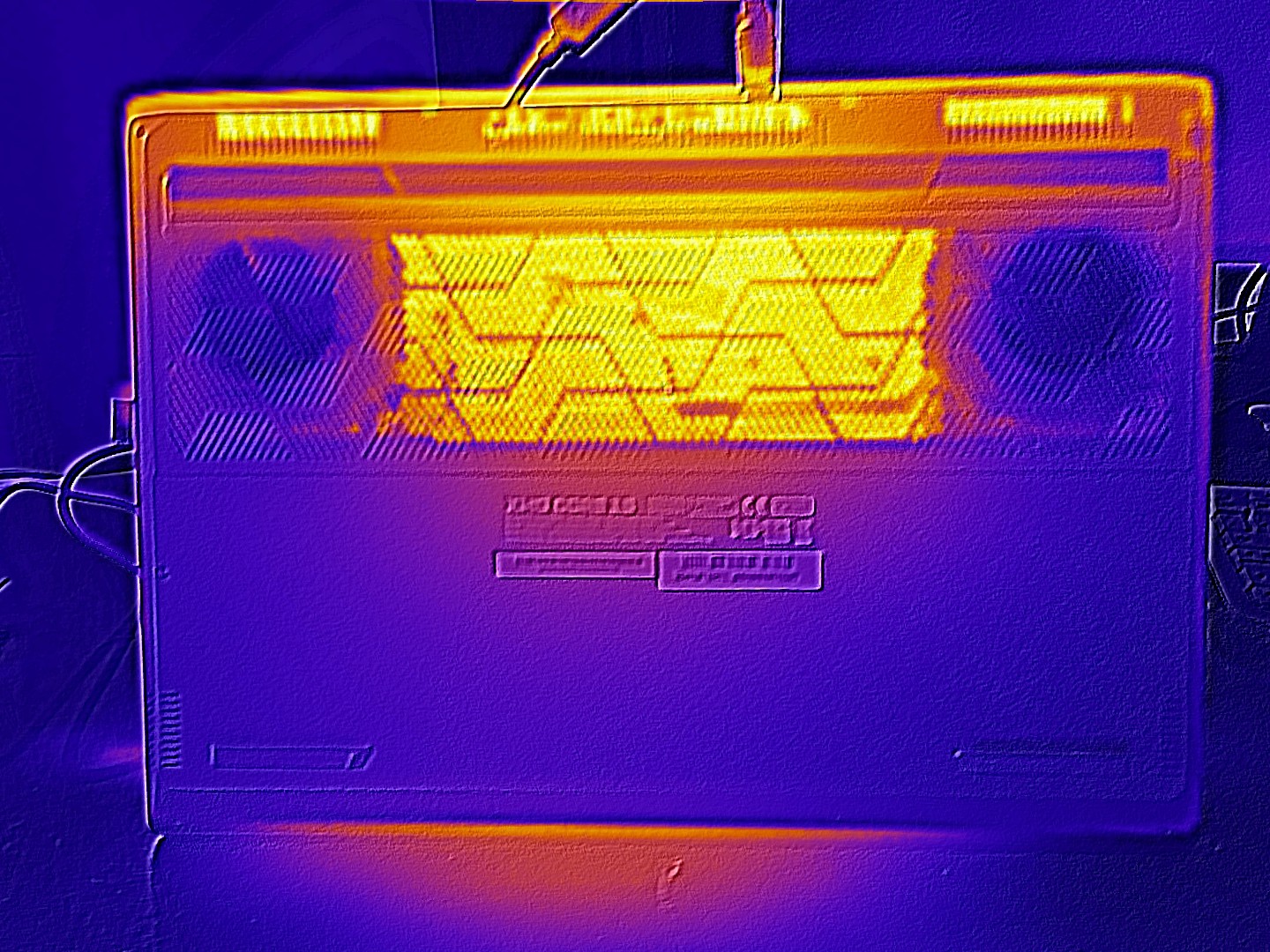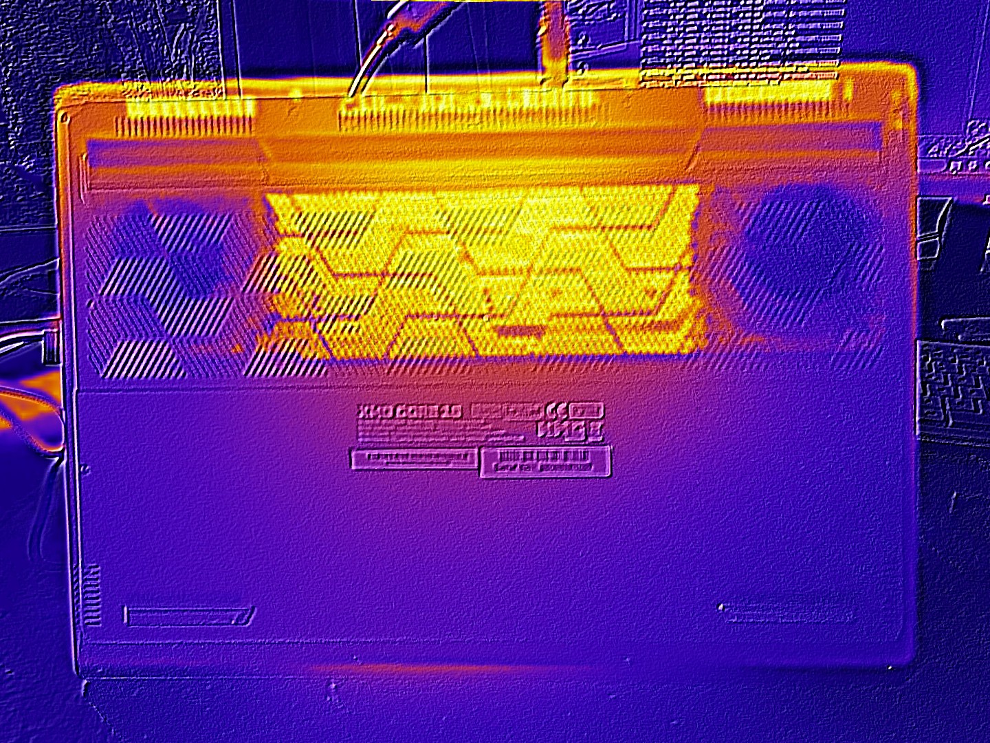 I risultati della temperatura sono contrastanti. Mentre lo chassis rimane per lo più sotto i 30 °C al minimo, le temperature superficiali salgono a quasi 50 °C nella parte superiore e a 60 °C nella parte inferiore sotto carico. Queste letture sono simili a quelle del Lenovo LOQ 15, mentre il Legion 5 è più freddo.