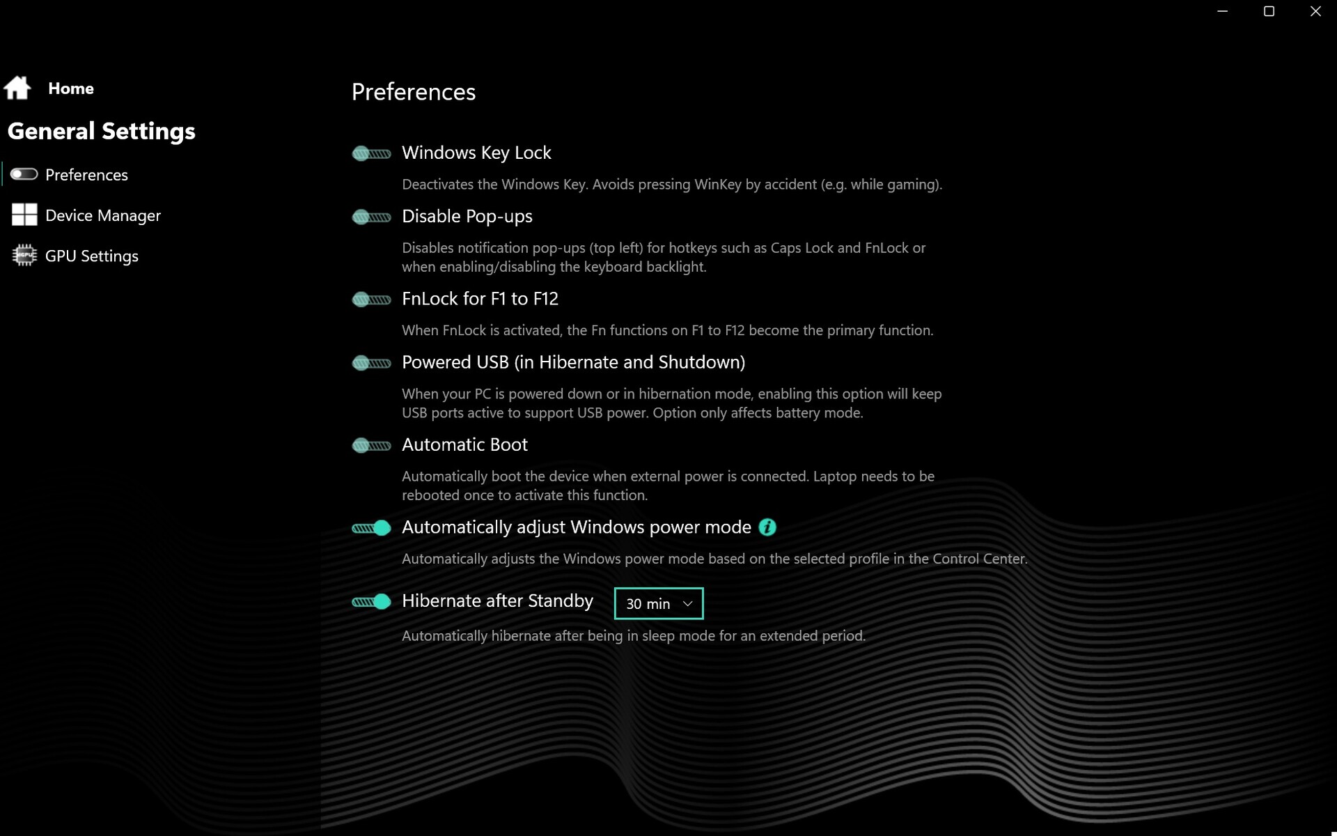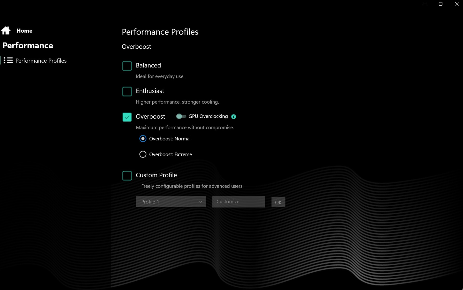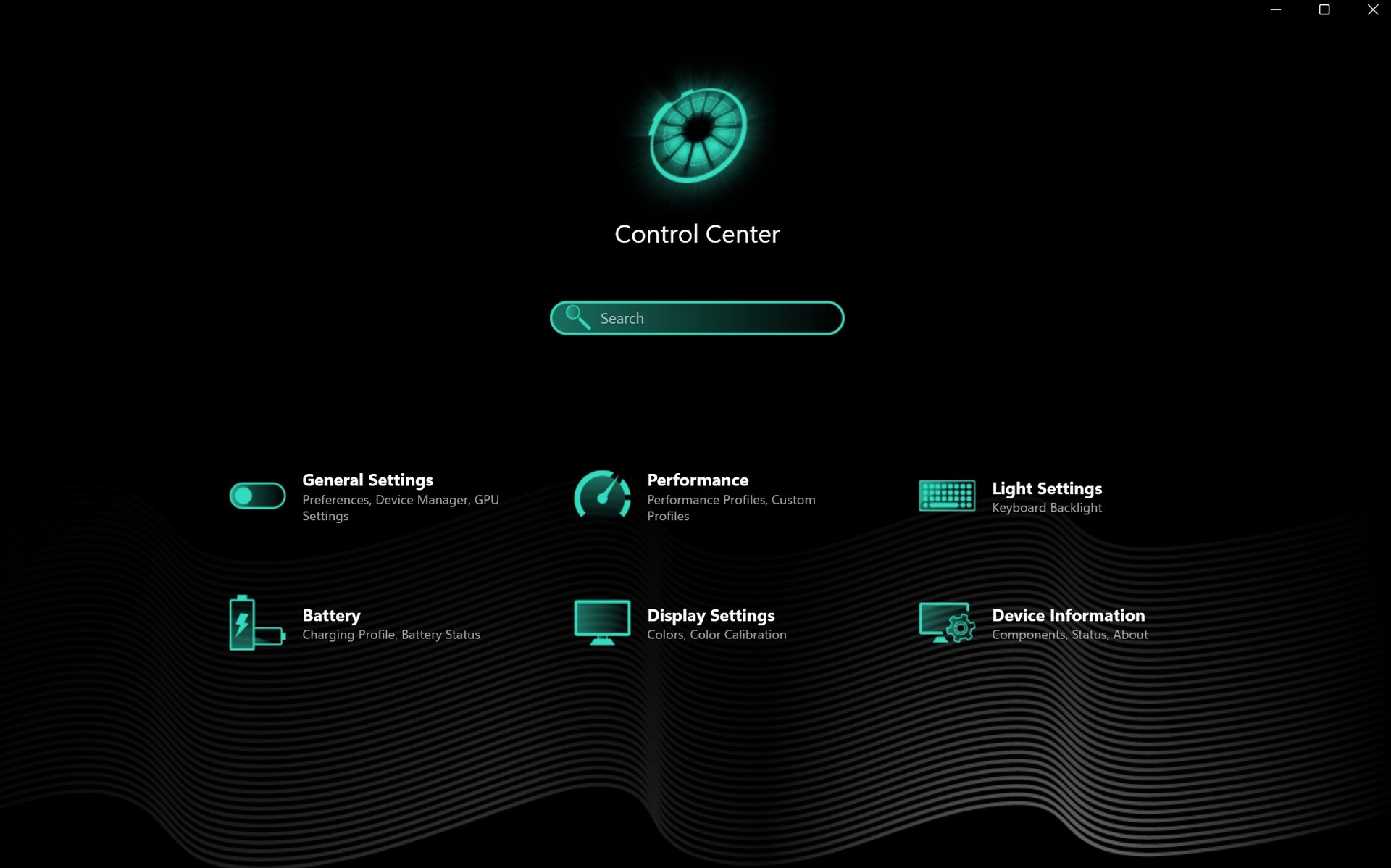 Il Control Center preinstallato offre una serie di funzioni e impostazioni. I giocatori saranno interessati soprattutto al menu delle prestazioni, che offre tre profili (vedere tabella). Ad eccezione del test della batteria, tutte le misurazioni sono state effettuate in modalità Overboost con l'overclocking della GPU disattivato. Se lo si desidera, è possibile creare un profilo personalizzato.