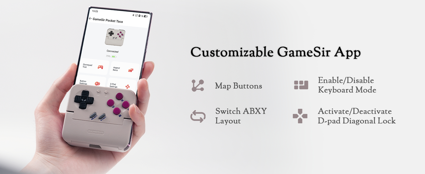 Il controller funziona con l'applicazione GameSir, che offre agli utenti una serie di opzioni di personalizzazione come la regolazione del rapporto d'aspetto/scalatura del display, la modifica del layout dei pulsanti (Switch o Xbox), lo scambio dei tasti L1 e L2 o R1 e R2, l'attivazione del blocco diagonale del D-pad e l'attivazione di una modalità tastiera.