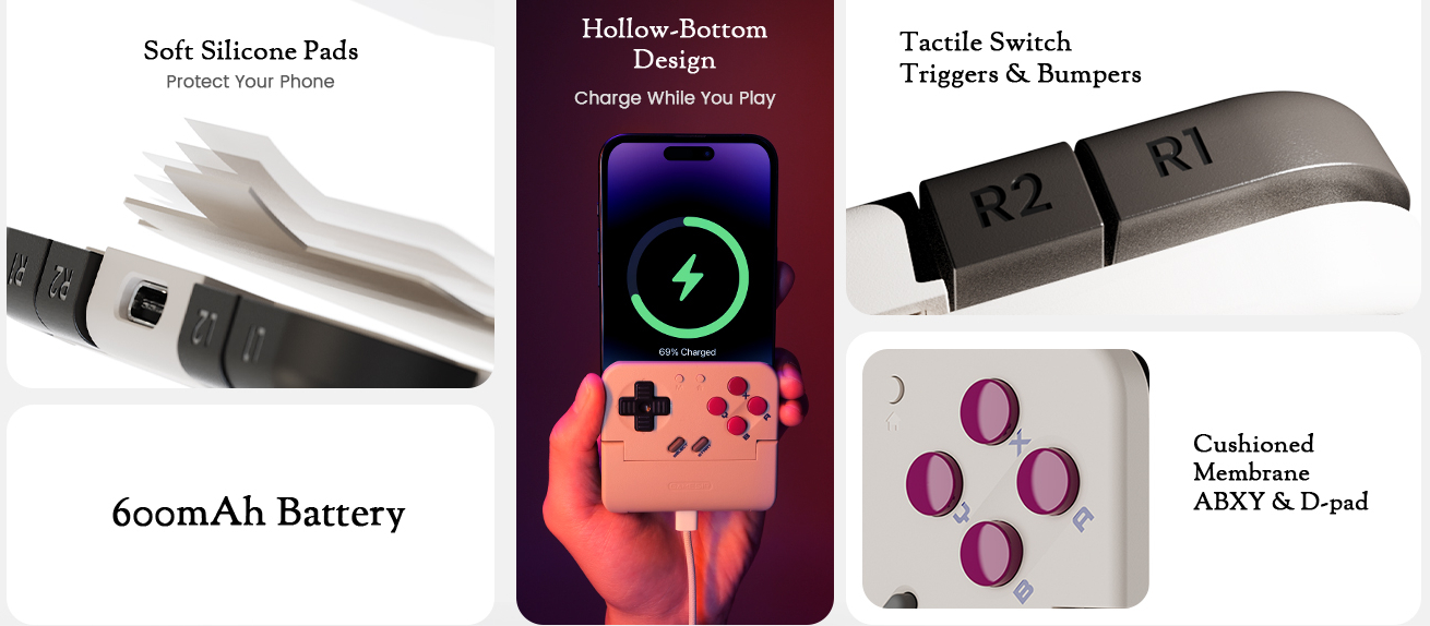 GameSir Pocket Taco pesa 62,2 grammi e ha una batteria integrata da 600 mAh che dovrebbe garantire ore di gioco. Il controller ha anche un fondo cavo che si allinea con la porta del suo telefono, consentendole di inserire un cavo di ricarica, in modo da poterlo ricaricare mentre gioca.
