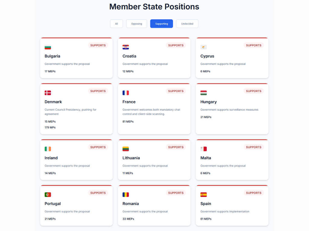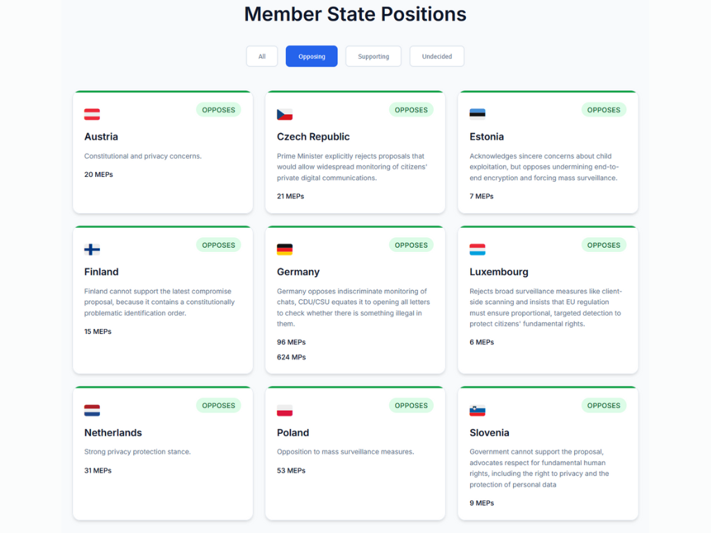 La crittografia end-to-end è progettata in modo che solo il mittente e il destinatario possano leggere i messaggi; la scansione in genere significa controllare il contenuto prima che venga crittografato sui dispositivi degli utenti, il che, secondo i sostenitori della sicurezza, indebolisce la privacy e la sicurezza del sistema. La posizione precedente del Parlamento rifiuta la scansione generalizzata e indiscriminata e cerca di proteggere la crittografia. Ciò potrebbe creare un potenziale scontro, se la linea del Consiglio si basa sull'Articolo 4 per spingere i fornitori verso la scansione lato client. Inoltre, nell'aprile 2024, una bozza trapelata riportata da Contexte indicava che i Ministeri degli Interni dell'UE stavano cercando di ottenere esenzioni per i conti professionali e le "informazioni riservate" da qualsiasi regime di scansione massiva, il che ha attirato le critiche dell'eurodeputato Patrick Breyer e dei gruppi per la tutela dei diritti per un doppio standard percepito.