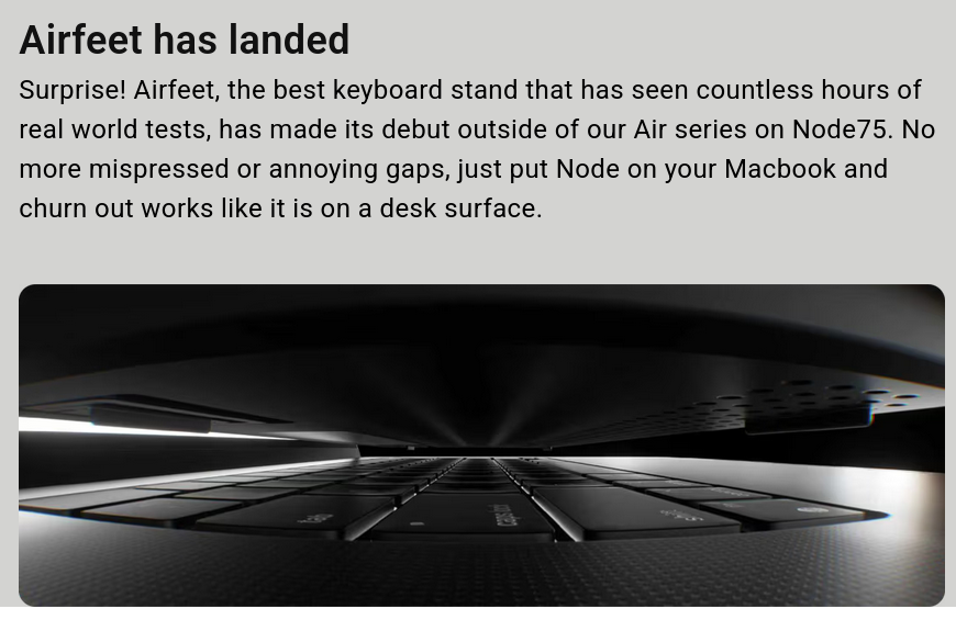 NuPhy Node75 avrà anche gli stessi piedini che consentono di posizionare le tastiere come la serie Air sulla parte superiore di una tastiera MacBook standard Apple senza azionare i tasti della tastiera integrata del laptop.