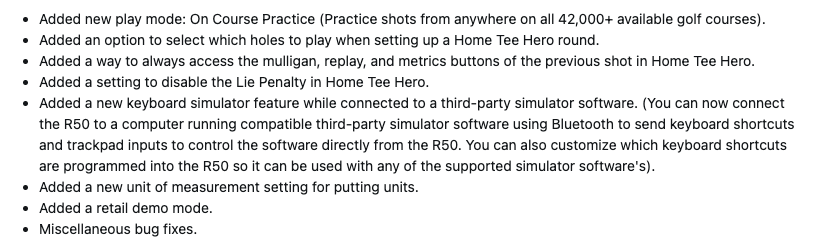 Con la versione software 4.80, gli utenti di Approach R50 ottengono una serie di nuove funzionalità. C'è una nuova modalità di gioco, Pratica sul campo, che consente di provare vari colpi su oltre 42.000 campi da golf. Gli utenti possono ora selezionare quale buca giocare durante un giro Home Tee Hero, e in questa modalità è possibile disattivare la penalità Lie. Inoltre, gli utenti possono ora accedere ai pulsanti mulligan, replay e metriche del colpo precedente in Home Tee Hero.