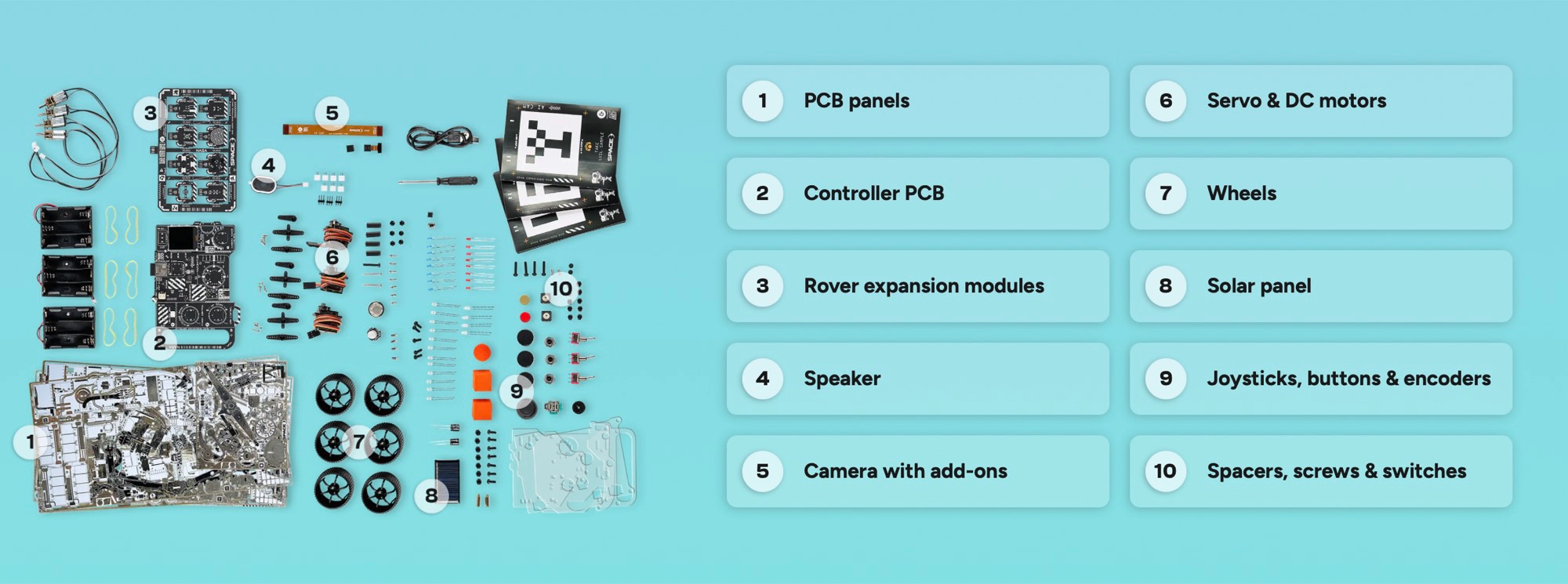 Il robot viene fornito come kit e deve essere assemblato seguendo le istruzioni dettagliate. L'obiettivo di questo processo è di impartire conoscenze di elettronica, robotica e comunicazione wireless. Una volta assemblato, il robot può essere controllato a distanza con un controller speciale. Non solo il robot può essere guidato, ma è anche possibile effettuare una panoramica della telecamera e controllare il braccio del robot.