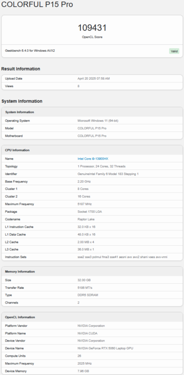Alimenta i laptop Colourful con configurazioni molto diverse, uno con un Intel Core i9-13900HX e l'altro con un Core Ultra 9 285H. Insieme al primo, il laptop RTX 5060 ottiene un punteggio di 109.431 nel test OpenCL di Geekbench, ma il punteggio scende a 102.564 con il secondo. Entrambe le SKU hanno 32 GB di RAM DDR5 che funzionano a velocità marginalmente diverse.