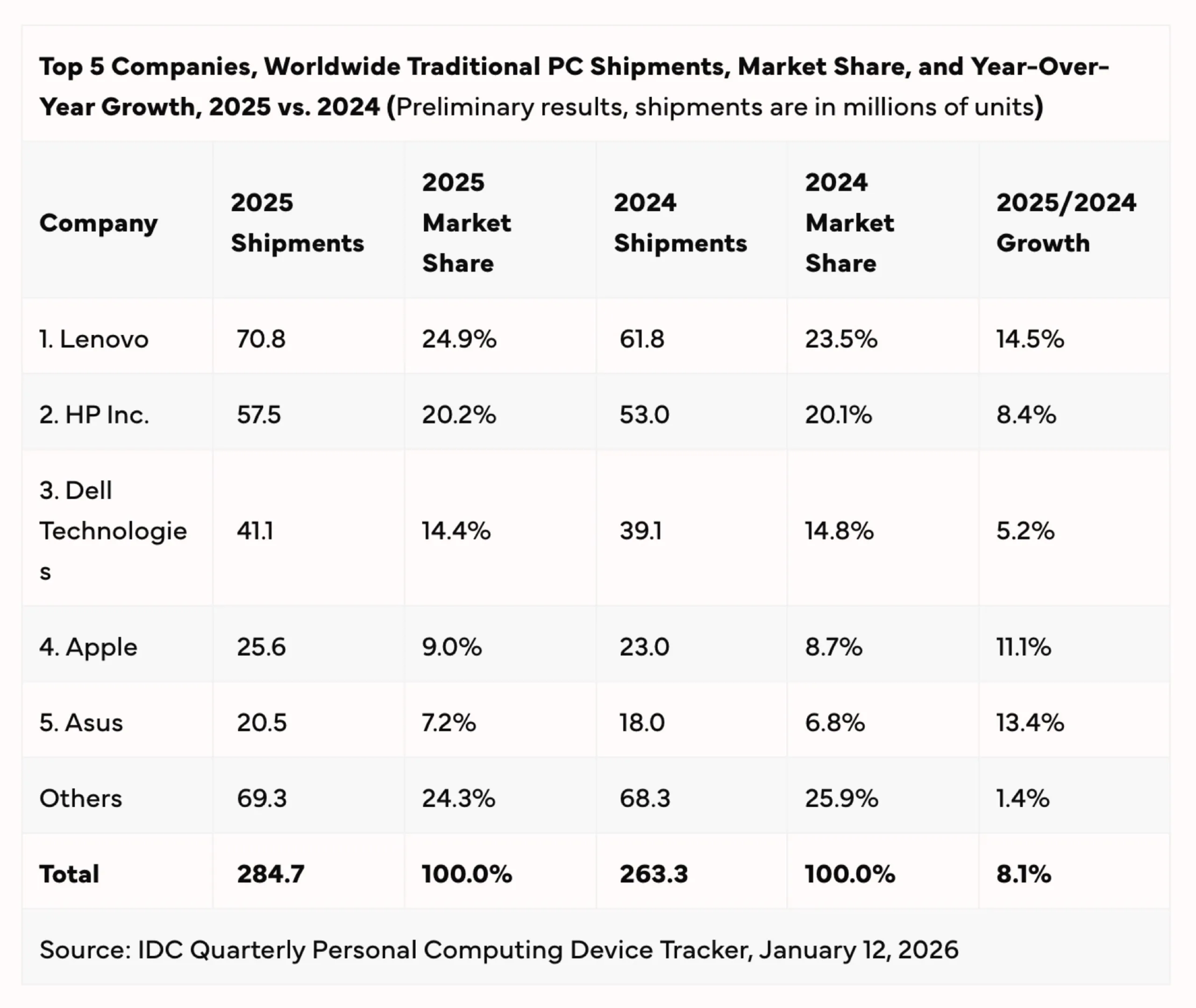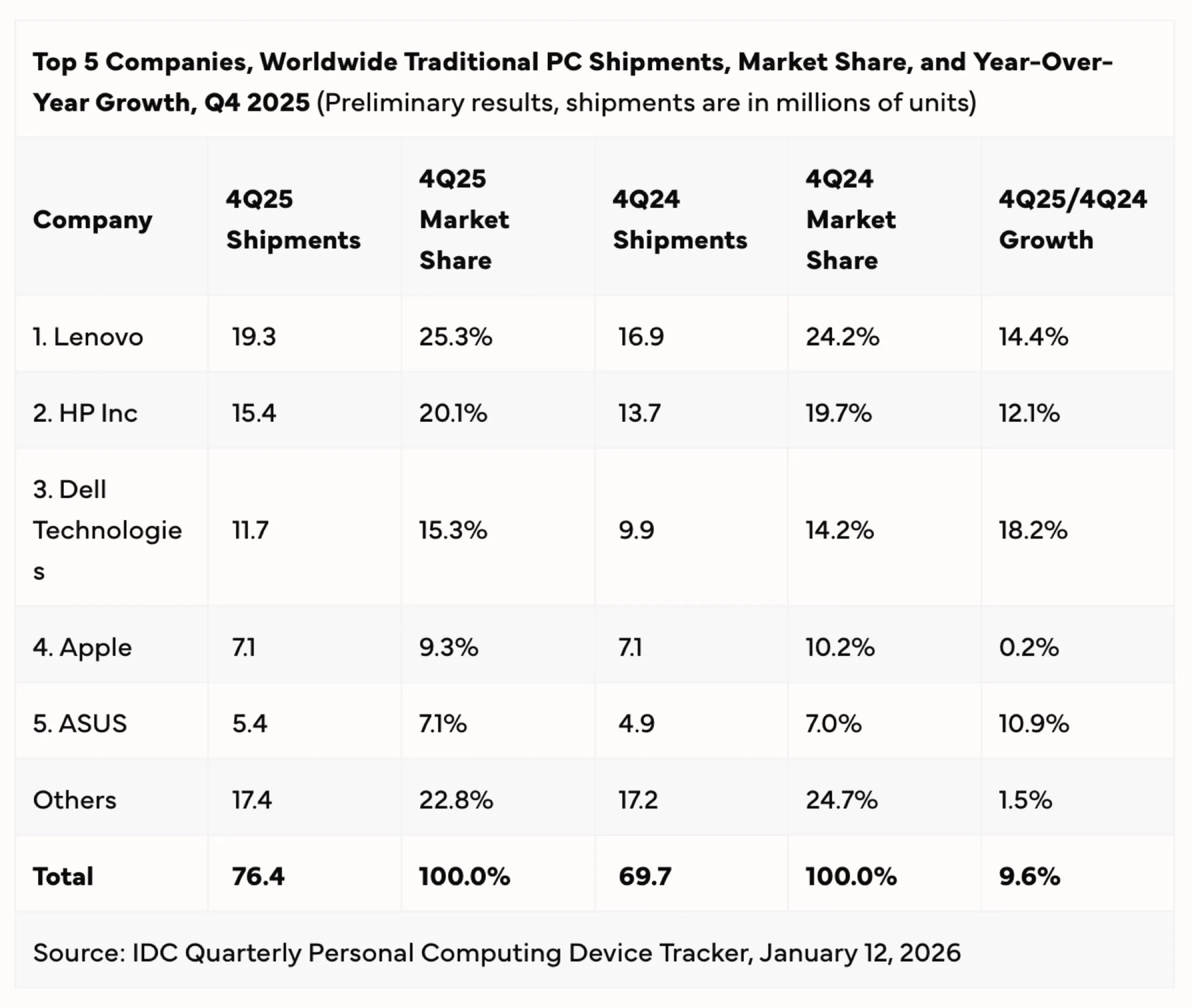 Verso la fine dell'anno, la carenza di DRAM è stata apparentemente la ragione principale dell'aumento delle vendite; i clienti volevano anticipare gli aumenti di prezzo previsti aumento dei prezzi previsto e mettere le mani su un PC a un prezzo più accessibile. Lenovo rimane il principale produttore di PC al mondo, avendo venduto 70,8 milioni di computer lo scorso anno, raggiungendo una quota di mercato del 24,9% e una crescita del 14,5%.