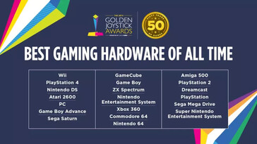 Per il Best Gaming Hardware Of All Time, Golden Joystick includeva candidati come PS 1/2/4, Nintendo SNES / N64 / Wii, PC, Atari 2600, ZX Spectrum, Amiga 500 e Commodore 64. Come si è scoperto, il PC (Master Race) ha vinto questa categoria con il 17% dei voti, seguito da PS2 con il 14%, SNES con il 9%, PS4 con l'8% e PS1 con il 7% Gabe Newell ha accettato il premio a nome di tutti i giocatori PC.