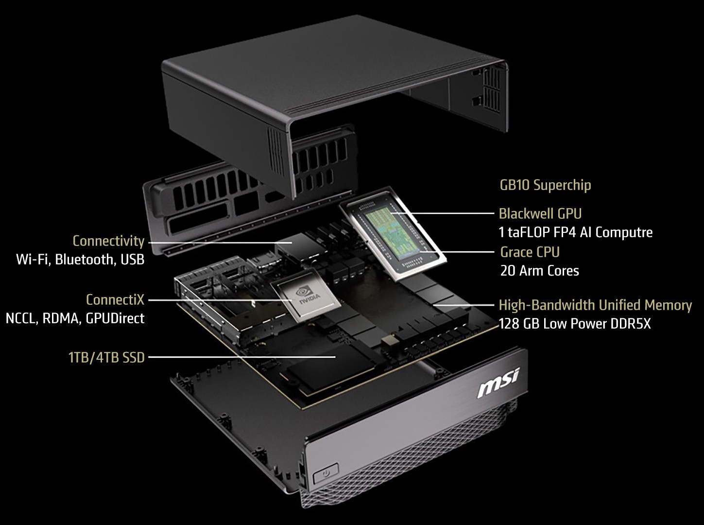 Le specifiche del modello 99SUS 1 TB sono essenzialmente le stesse dell'originale MS-C931, tranne che per il fatto che la versione Bluetooth è stata declassata da 5.4 a 5.3. Per il resto, è alimentato dal GB10 con una GPU Blackwell in grado di elaborare 1 PetaFLOP di istruzioni FP4 AI e una CPU Grace con 10 core ARM Cortex-X925 e 10 core ARM Cortex-A725. Il superchip è completato da 128 GB di memoria di sistema unificata LPDDR5X con 273 GB/s di larghezza di banda. Sia la CPU che la GPU possono accedere al pool di RAM LPDDR5X tramite un'interconnessione NVLink C2C che offre una larghezza di banda PCIe 5.0 pari a 5x. Per quanto riguarda l'archiviazione, MSI offre opzioni di SSD NVMe da 1 o 4 TB. Il case misura 151 x 151 x 52 mm (1,19L di volume) e pesa 1,2 kg.