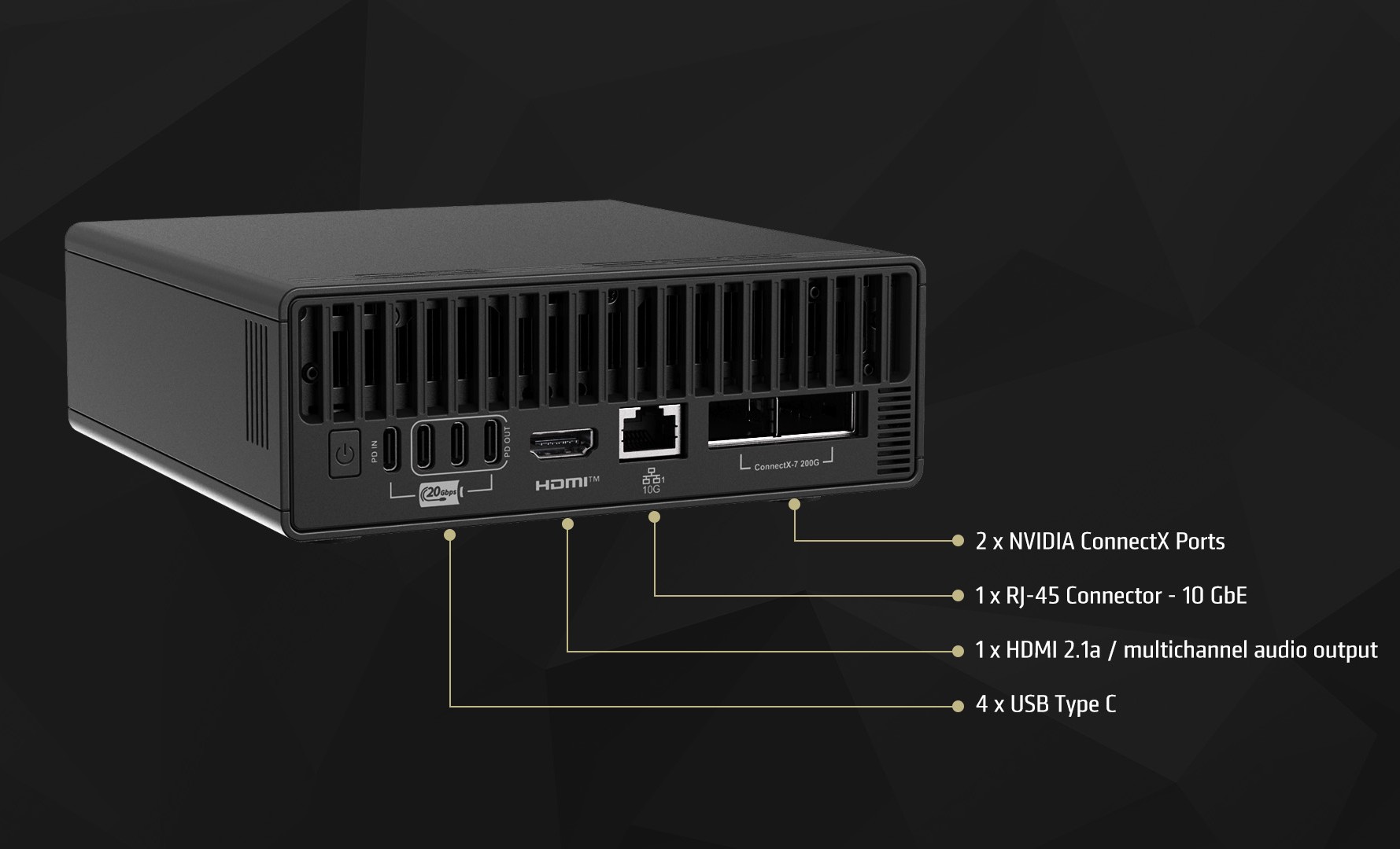 La selezione di porte comprende 4X porte USB-C 3.2 20 Gbps con funzionalità PD, un'uscita video HDMI 2.1a con uscita audio multicanale, un NIC 10 GbE e 2x Nvidia ConnectX-7. La connettività wireless è garantita da un Wi-Fi 7 + scheda BT 5.3.