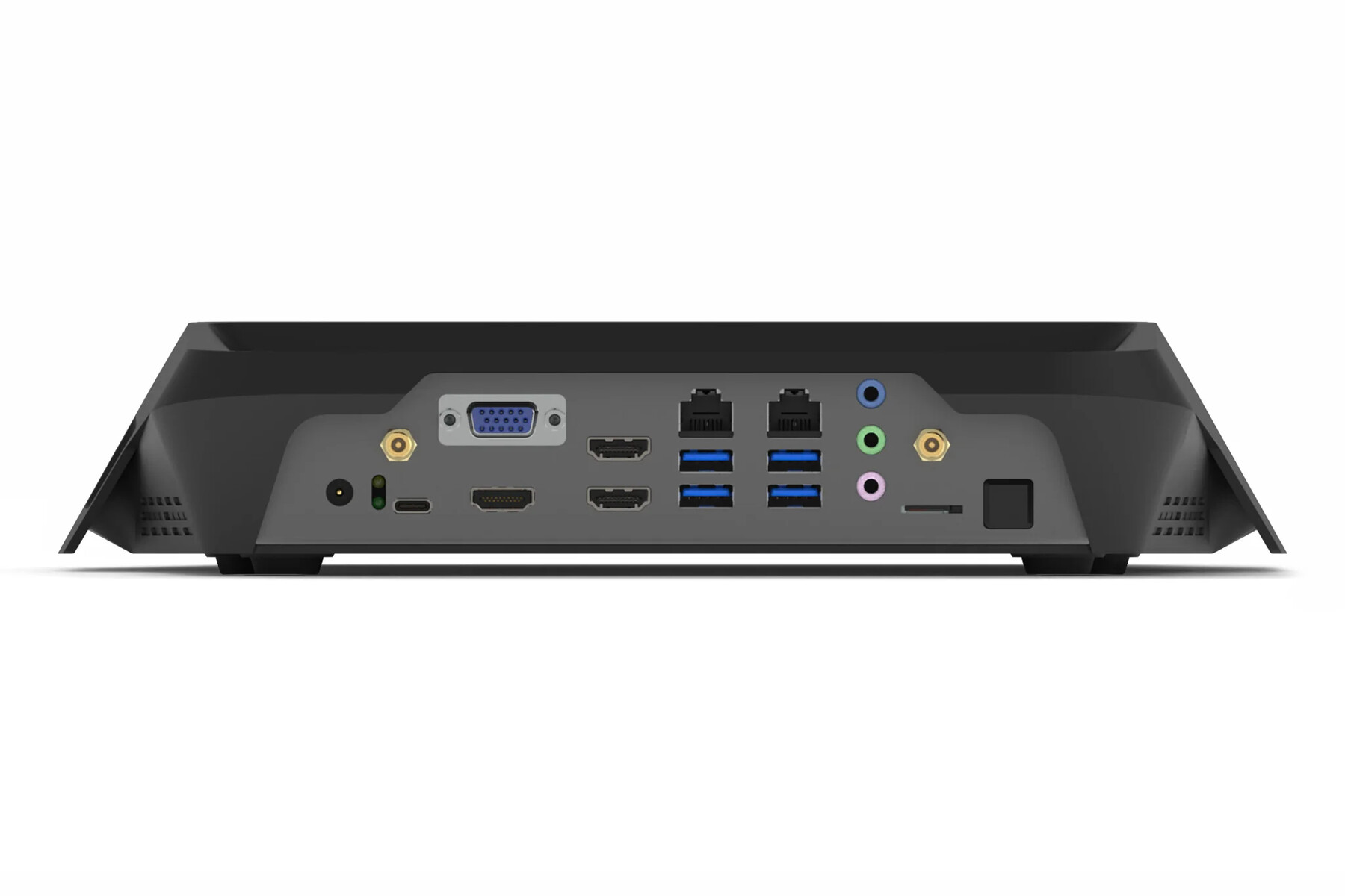 La selezione delle porte è particolarmente generosa per un sistema basato su ARM. L'XR1 è dotato di 1x USB-C 2.0, 3x USB-A 2.0, 2x USB-A 3.0, un'uscita video HDMI 2.0, 2x jack GbE, lettore di schede microSD e jack audio + microfono. Il modello XR2 offre un numero ancora maggiore di porte: 1x USB-C 3.0, 4x USB-A 3.0, 1x USB-C 2.0, 1x USB-A 2.0, 2x HDMI 2.1 + 1x HDMI 2.0 + 1x uscite video VGA, 2x jack GbE, 1x lettore di schede microSD, jack audio line in + line out + mic. L'XR2 è inoltre dotato di due antenne Wi-Fi.