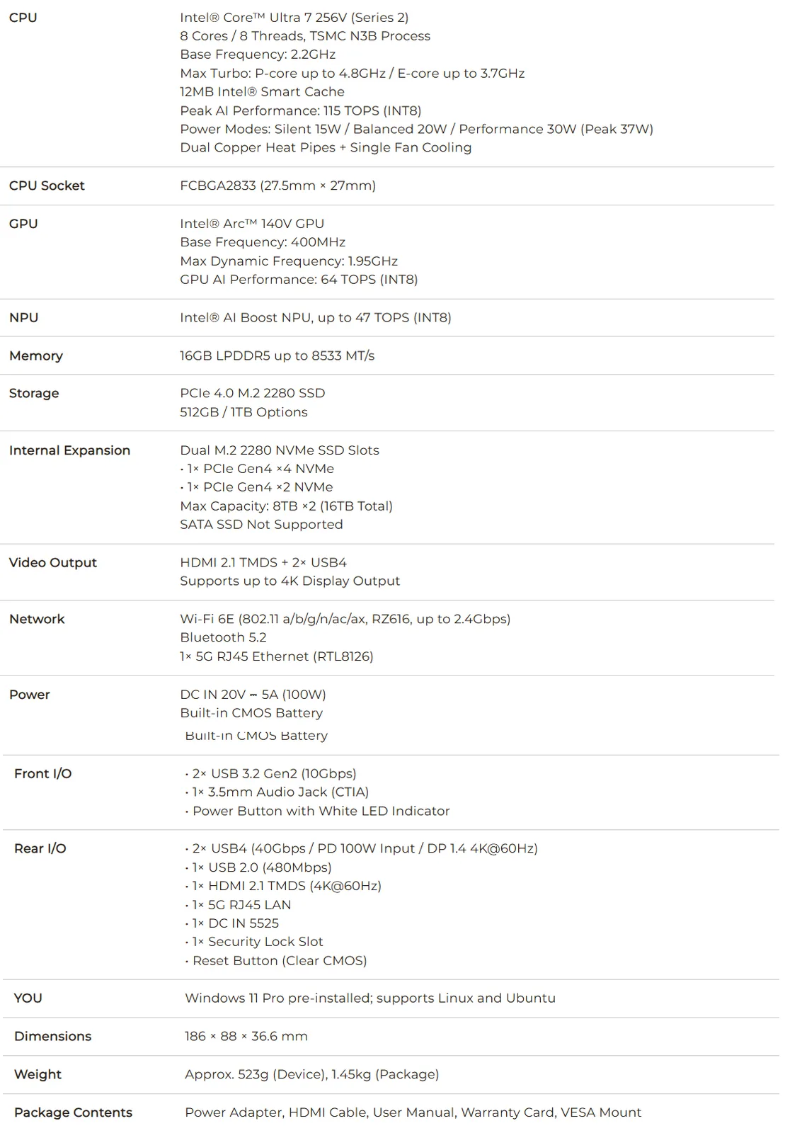 Sotto il cofano, questo piccolo mini PC contiene l'Intel Core Ultra 7 256V, un processore di fascia media superiore della linea Lunar Lake. Presenta l'iGPU Arc 140V che può gestire senza problemi un buon numero di giochi moderni alla risoluzione di 1080p con modifiche alle impostazioni visive.