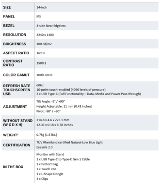 Secondo Lenovo, il monitor mobile copre il 100% della gamma di colori sRGB e dovrebbe offrire un rapporto di contrasto di 1500:1. Il display è dotato di un sistema NearEdgelgel, che consente di visualizzare le immagini in modo ottimale. Il display presenta un design NearEdgeless su tre lati e viene fornito con la certificazione TÜV Rheinland e la tecnologia Eyesafe 2.0 per basse emissioni di luce blu senza influire sui colori.