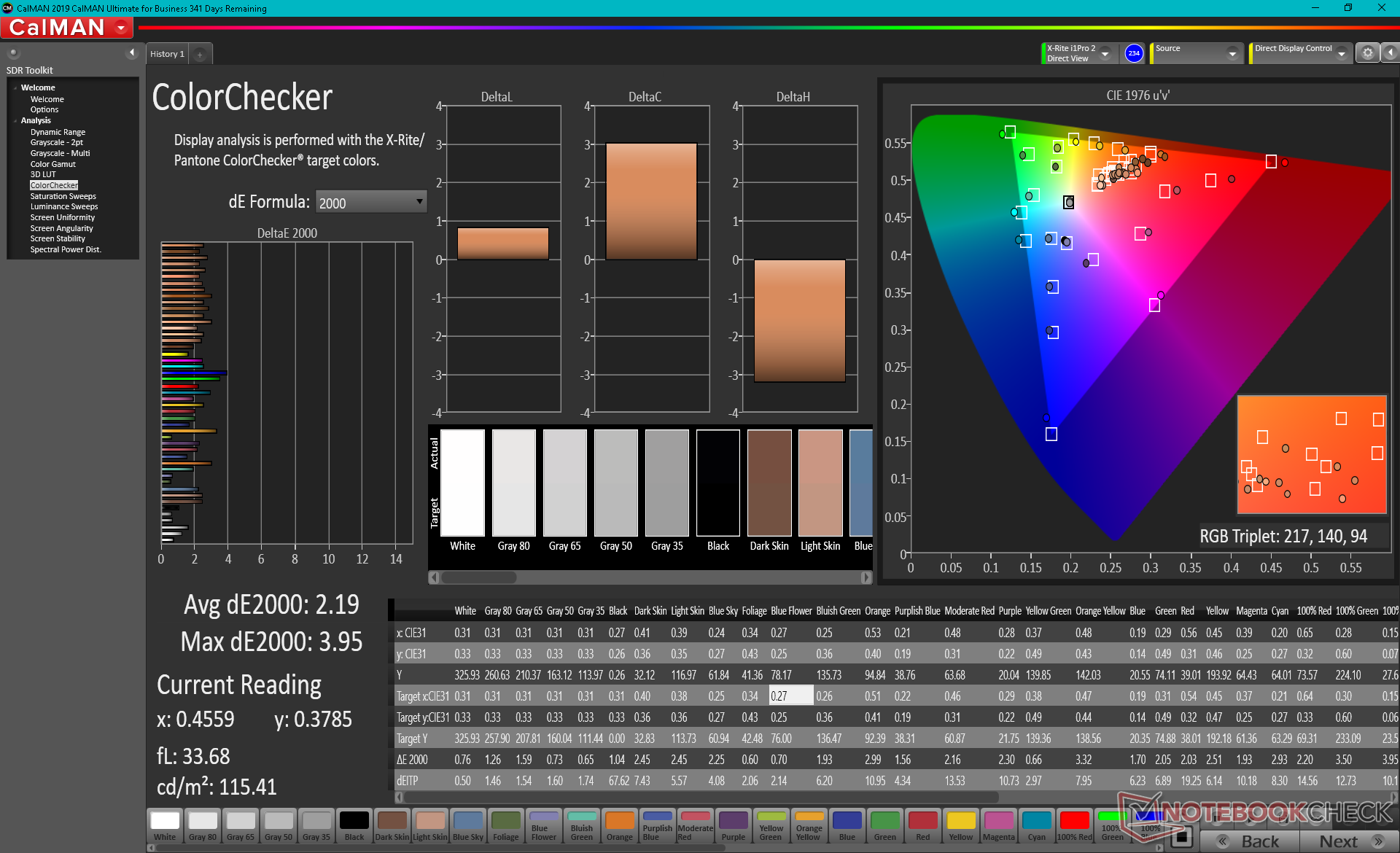 Le misurazioni del colorimetro X-Rite mostrano un display mal calibrato con una temperatura di colore troppo calda. Calibrando noi stessi il pannello si migliora significativamente la scala dei grigi da un DeltaE medio di 6,2 fino ad appena 0,9. Si consiglia di applicare il nostro profilo ICM calibrato di cui sopra.