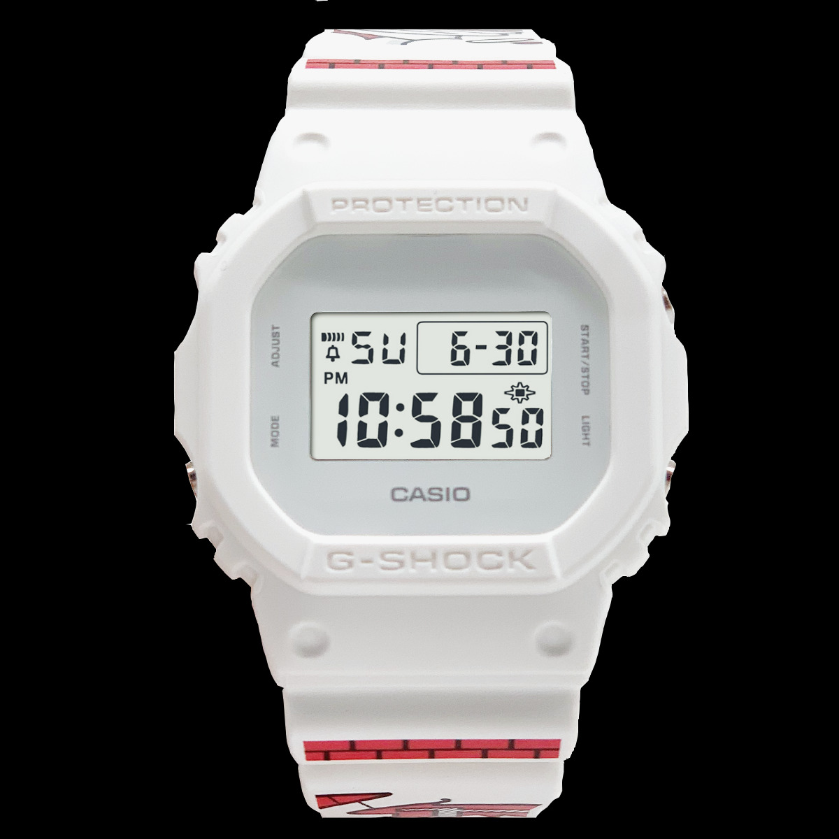 Sotto l'arte, c'è la scheda tecnica standard di G-Shock DW-5600: resistenza agli urti, resistenza all'acqua di 200 metri, retroilluminazione a LED (bianca), sveglia multifunzione, timer per il conto alla rovescia, cronometro e una durata della batteria di cinque anni. Il cinturino e la cassa utilizzano una resina a base biologica, in linea con la spinta di Casio verso materiali più sostenibili.
