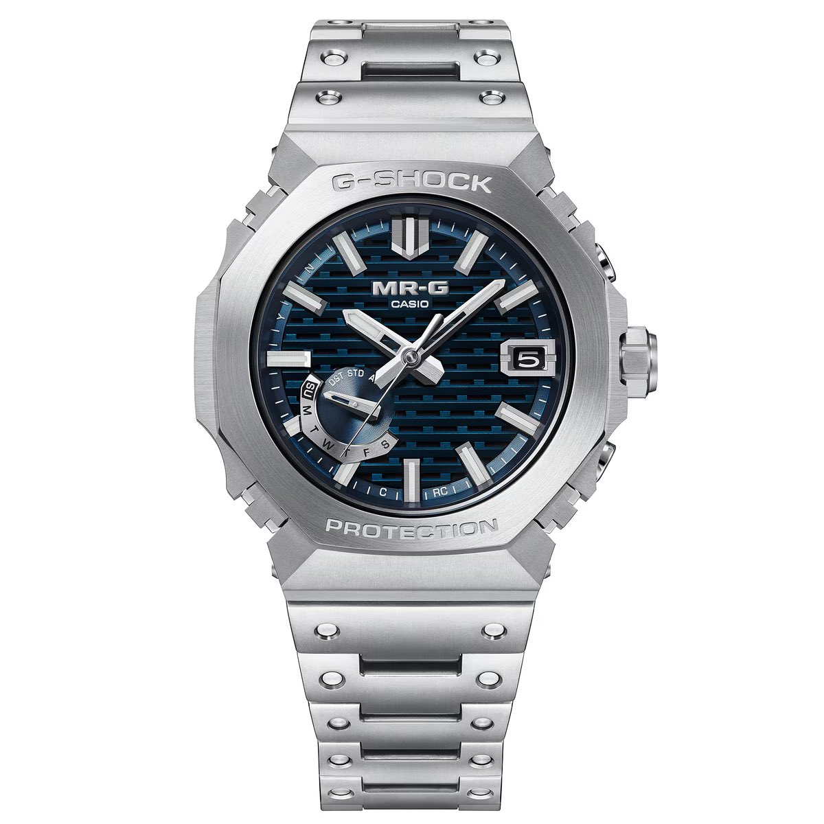 La lunetta superiore di MRG-B2100D è realizzata in Cobarion, una lega ad alta durezza con una lucentezza simile al platino (si dice che sia quattro volte più dura del titanio puro), mentre il bracciale utilizza la lega di titanio DAT55G per una maggiore durata. La struttura Multi-Guard di Casio e i tamponi interni aiutano a garantire che tutta questa raffinatezza soddisfi ancora i famosi e severi standard di resistenza agli urti di G-Shock.