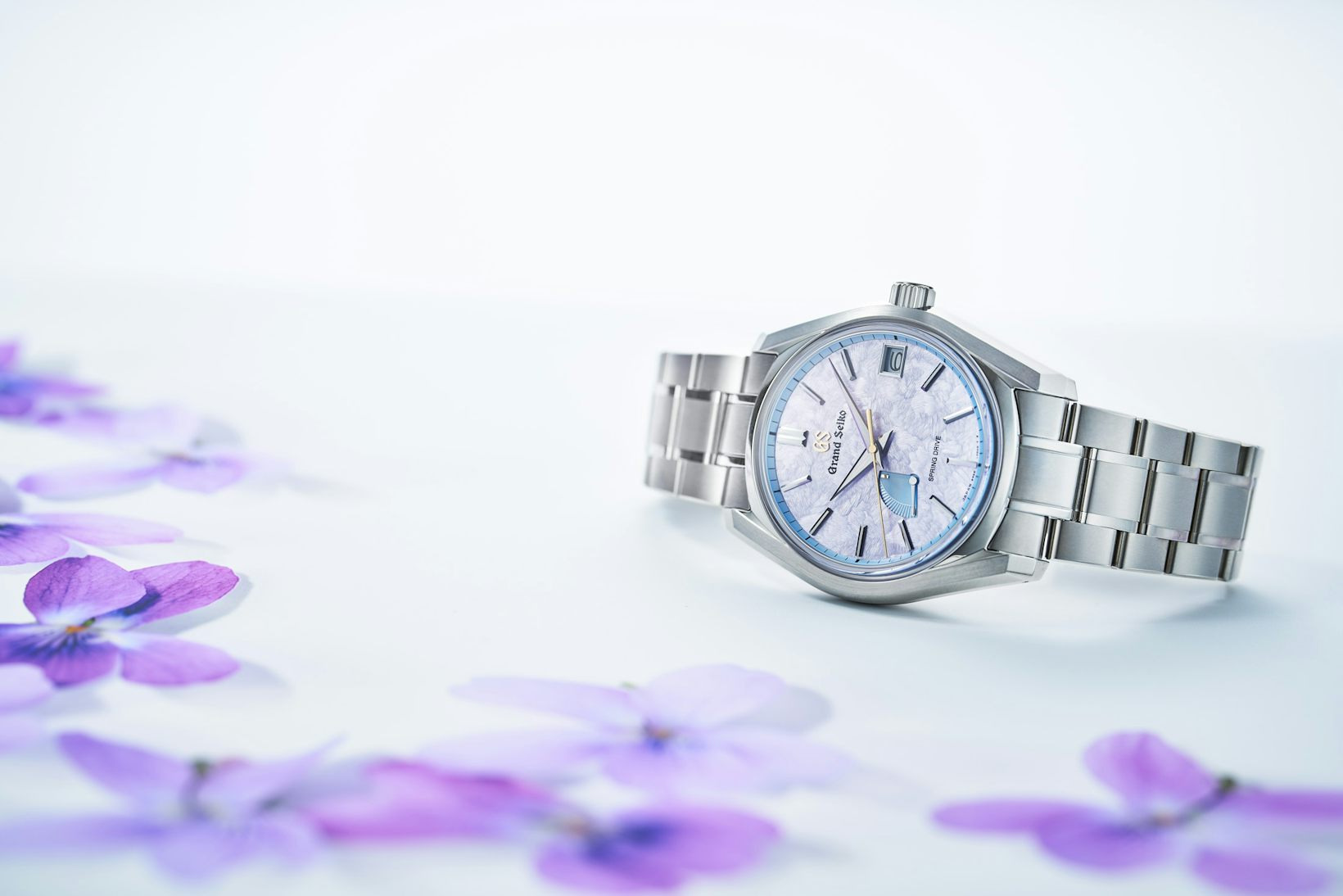 La palette di colori fa riferimento al fiore "Sumire" (viola). Il quadrante presenta una morbida tonalità grigio-viola, insieme a un indicatore della riserva di carica blu e a un anello perimetrale blu. Grazie agli elementi dorati, tra cui il logo GS e la lancetta dei secondi, otteniamo un netto contrasto con il motivo strutturato "Hana-ikada", che vuole imitare i fiori di ciliegio che galleggiano sull'acqua.
