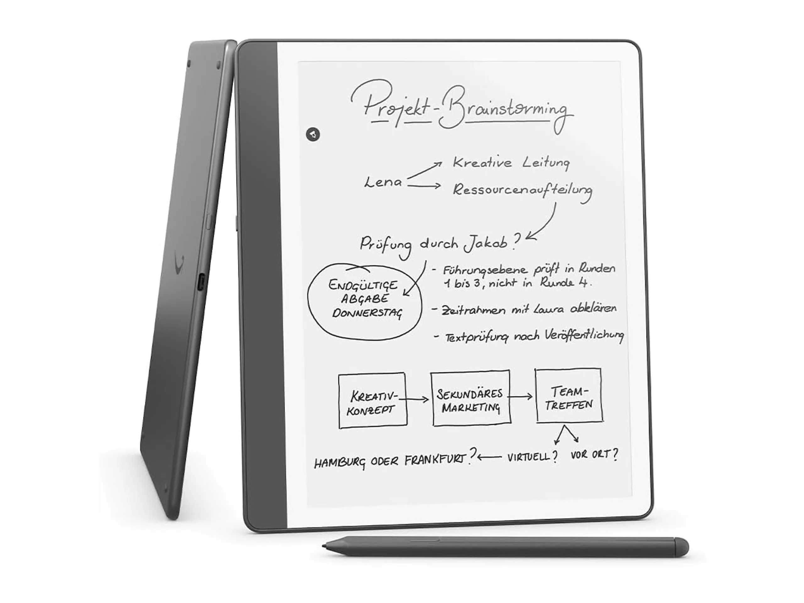 L'e-book da 196 x 230 millimetri è dotato di uno schermo da 10,2 pollici con una densità di pixel di 300 PPI. Non è possibile visualizzare contenuti di immagine a colori, quindi il display è limitato a 16 tonalità di grigio e non è particolarmente adatto ai fumetti. Come accennato in precedenza, è supportato l'input tramite stilo, che non è certo scontato negli e-reader. Questo permette agli utenti di prendere appunti o creare disegni, ad esempio, con la sensazione di scrivere su carta. Lo stilo è dotato di un pulsante di scelta rapida definibile dall'utente e non deve essere configurato o caricato in modo particolare.