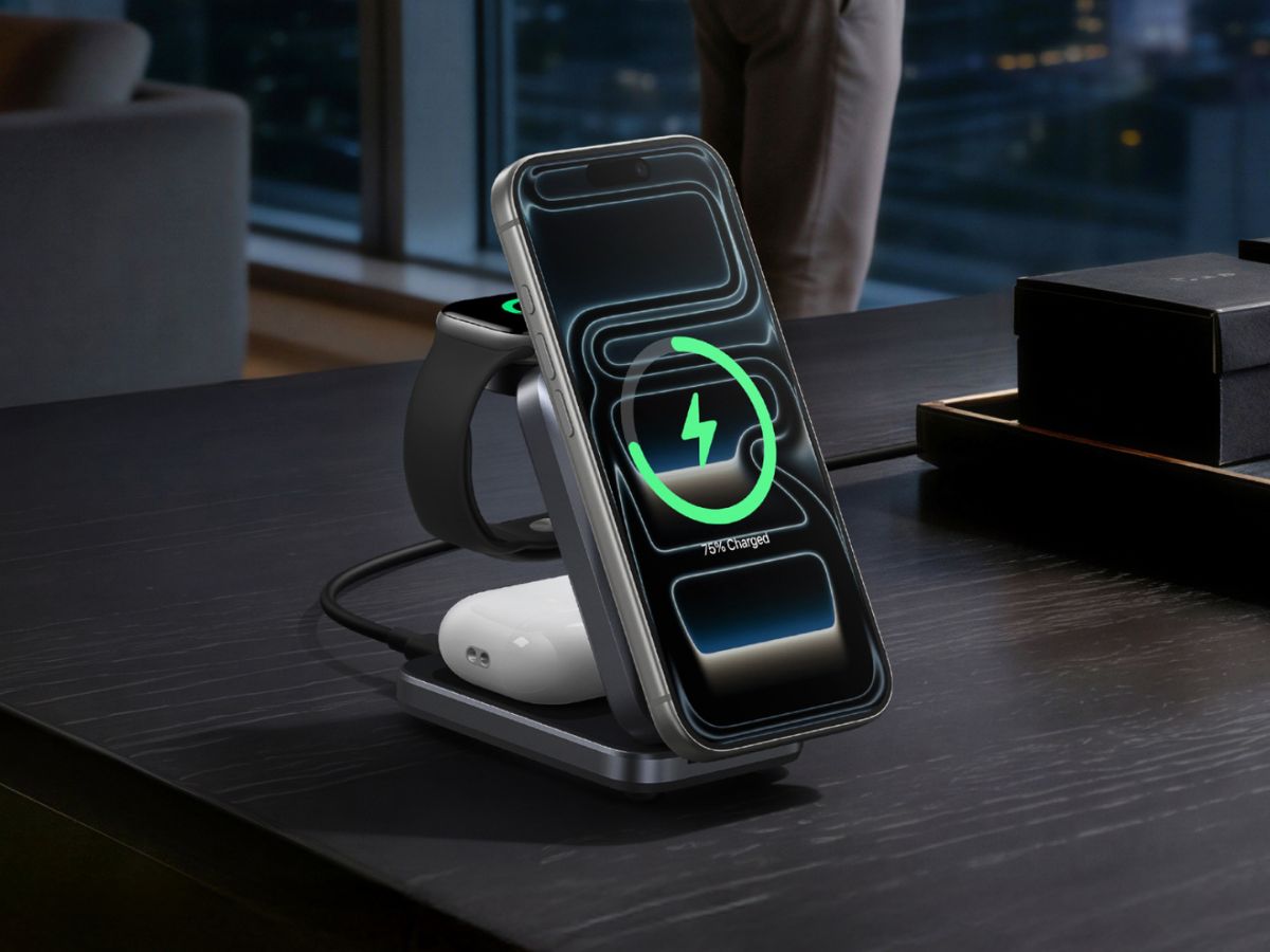 La nuova Prime Wireless Charging Station di Anker è progettata per caricare contemporaneamente un telefono, un orologio Apple e delle cuffie wireless. Per un iPhone o un Google Pixel, c'è un pad di ricarica wireless Qi 2.2, che eroga fino a 25W di potenza. Questo si trova nella parte superiore dell'accessorio, che può essere inclinato fino a 60°, consentendo agli utenti di accedere ad altri due pad di ricarica wireless al di sotto. Sulla base si trova il caricatore più grande, progettato per una custodia per auricolari, con un'uscita fino a 5W. Dietro la sezione superiore del caricatore c'è un caricatore a comparsa per Apple Watch, sempre in grado di erogare 5W in modalità wireless.