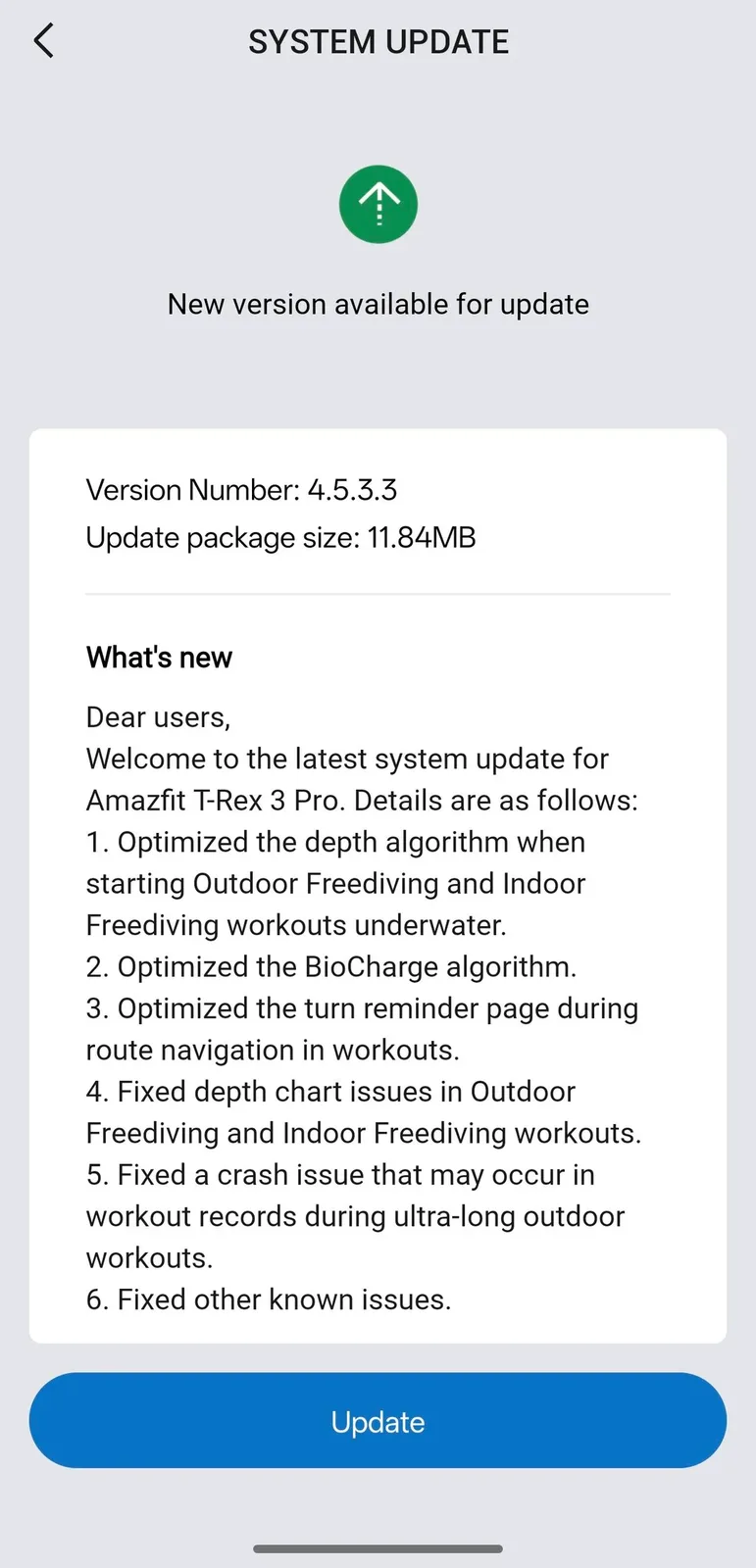 La versione software 4.5.3.3 è stata segnalata dagli utenti dello smartwatch Amazfit T-Rex 3 Pro su Reddit. Questo file da 11,84 MB avrebbe apportato delle ottimizzazioni all'algoritmo di profondità, legate agli allenamenti Outdoor Freediving e Indoor Freediving. Si dice anche che siano stati apportati miglioramenti alla pagina di promemoria delle svolte, che viene servita agli utenti a metà allenamento quando si utilizza la funzione di navigazione del percorso. Inoltre, Zepp Health indica di aver migliorato l'algoritmo BioCharge, anche se non quantifica i vantaggi per gli utenti.