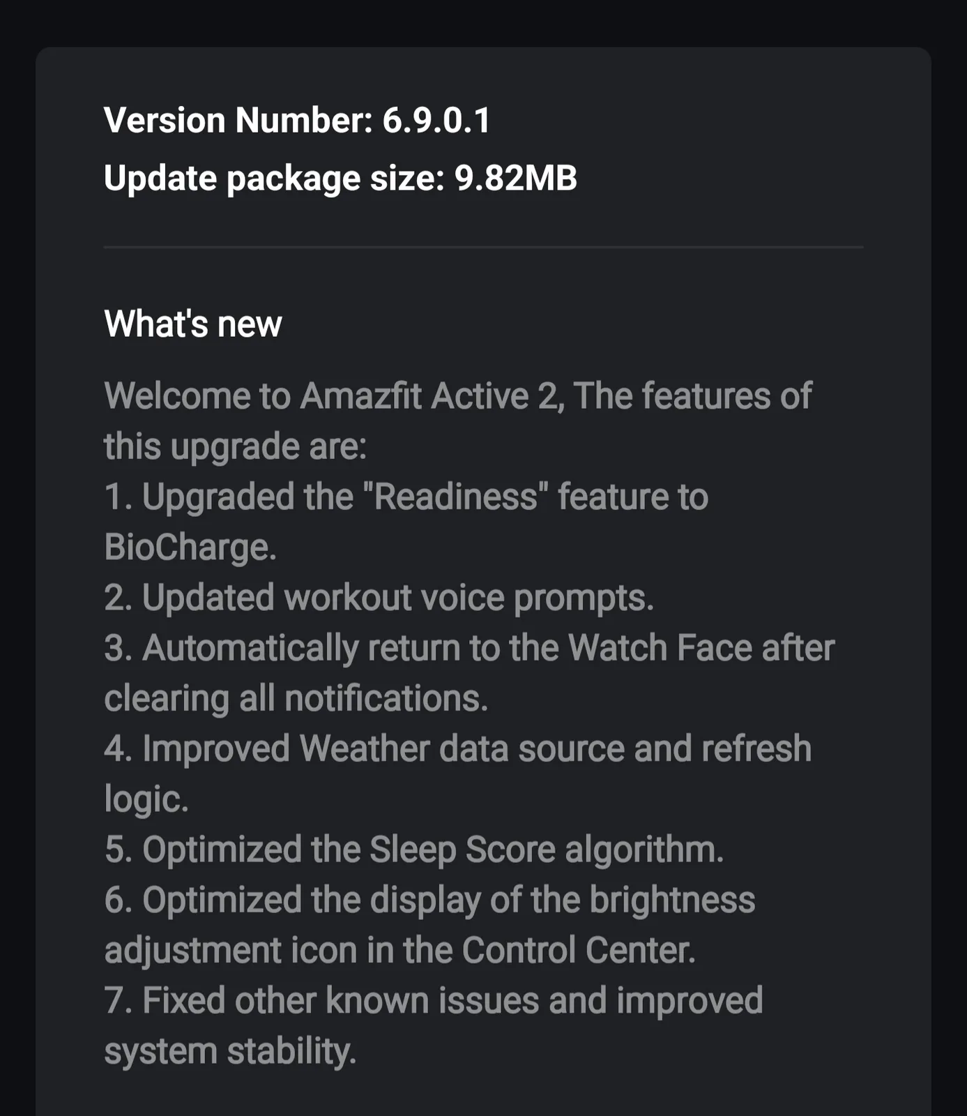 Il registro delle modifiche per la versione software 6.9.0.1 apporta anche altri nuovi miglioramenti agli utenti dell'orologio Active 2. Si dice che i suggerimenti vocali per l'allenamento siano stati aggiornati e che si tornerà automaticamente al quadrante dell'orologio dopo aver cancellato tutte le notifiche. Si dice anche che ci siano ottimizzazioni per il Meteo e il Punteggio del sonno, e l'esperienza dell'utente quando regola la luminosità del display dal Centro di controllo è stata migliorata.