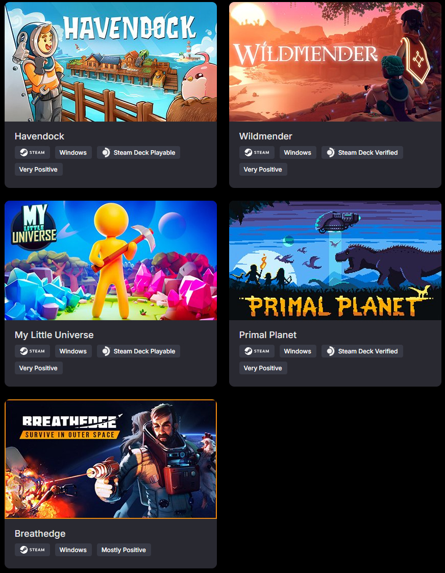 - Breathedge - un gioco di sopravvivenza open-world con meccaniche di crafting e una buona accoglienza generale da parte dei giocatori. È etichettato come Steam Deck Unsupported, ma funziona benissimo sul palmare di gioco con alcune modifiche. Il prezzo al dettaglio è di 24,99 dollari e il minimo storico è di 6,24 dollari.