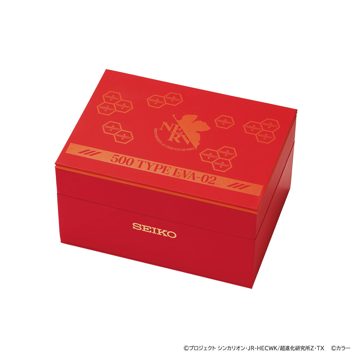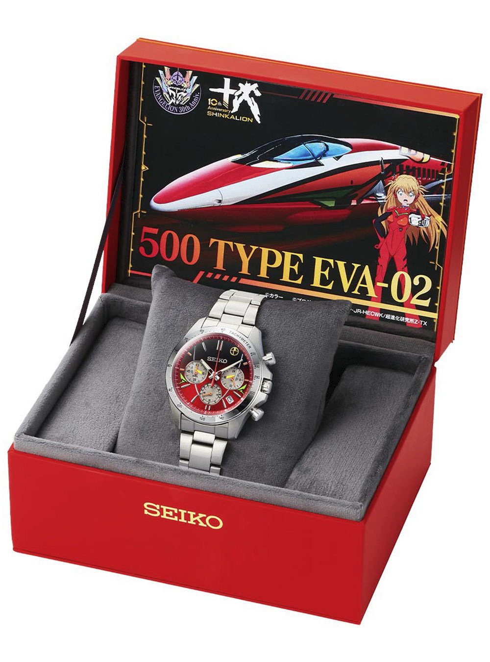 L'orologio segue le precedenti collaborazioni di Seiko con Evangelion e Shinkalion, ma questo è più simile alla livrea del treno 500 Type EVA-02 che percorreva la linea Sanyō Shinkansen come parte di un progetto per l'anniversario di Evangelion nel mondo reale. Lo schema di colori viene ripreso quasi uno a uno: sezioni esterne rosse, centro nero e accenti metallici che ricordano i dettagli della cabina del treno. Persino l'indicatore a ore 1 replica la cornice circolare del finestrino utilizzata sullo Shinkansen a tema EVA-02.