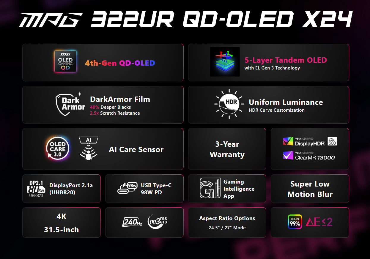 Dal punto di vista del pannello, il modello "X24" è dotato di un pannello pannello QD-OLED tandem di quarta generazione (probabilmente di LG), costruito sulla tecnologia EL Gen 3. Questa configurazione a 5 strati sostiene di aumentare l'efficienza luminosa del 30% e di ridurre il consumo energetico. La protezione è affidata alla pellicola "DarkArmor" - MSI afferma che aumenta la resistenza ai graffi di 2,5 volte e approfondisce i neri del 40% - e a un sensore AI Care Sensor alimentato da NPU che oscura lo schermo quando non viene rilevata la presenza umana per evitare la bruciatura. Automatizza la protezione dei pixel in base alla "consapevolezza ambientale in tempo reale".