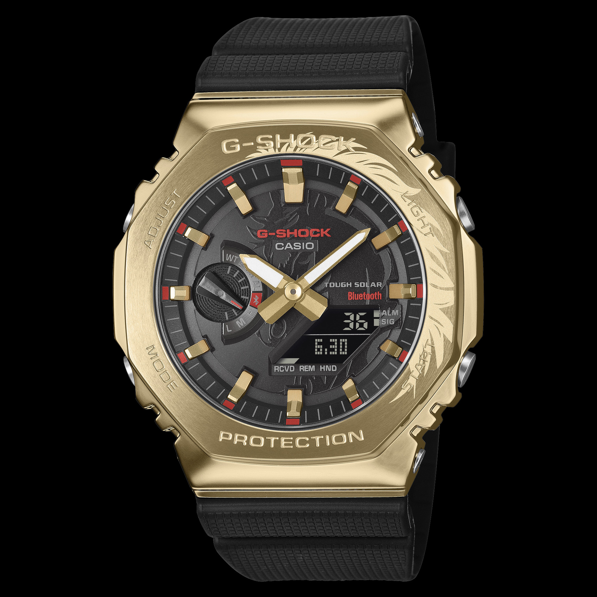 Il GBM-2100CX-9A di Casio presenta il mitico cavallo mille-li, impresso sul quadrante nero. La criniera del cavallo è incisa sulla lunetta in acciaio inossidabile color oro e l'animale si ritrova sul fondello in metallo. Questo orologio ha una cassa e un cinturino in resina nera, con accenti rossi sul quadrante.