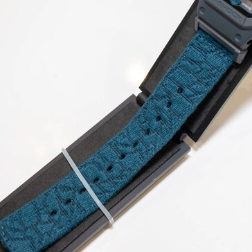 Il design è all'insegna della sostenibilità, come dimostra anche l'iniziativa "Untangle It" associata all'orologio. La lunetta e la cassa utilizzano resine bio-based, mentre il cinturino è costituito da una fascia trasversale in tessuto realizzata con reti da pesca riciclate. La fotografia ravvicinata rivela un tessuto blu scuro o verde acqua con un motivo geometrico ripetitivo e strutturato, che vuole assomigliare alla superficie dell'oceano. Questa scelta di materiale è molto diversa dai cinturini in resina standard presenti sulla maggior parte dei modelli 5600. Sarà facilmente uno dei maggiori punti di vendita di questo orologio, se non fosse per il display MIP.