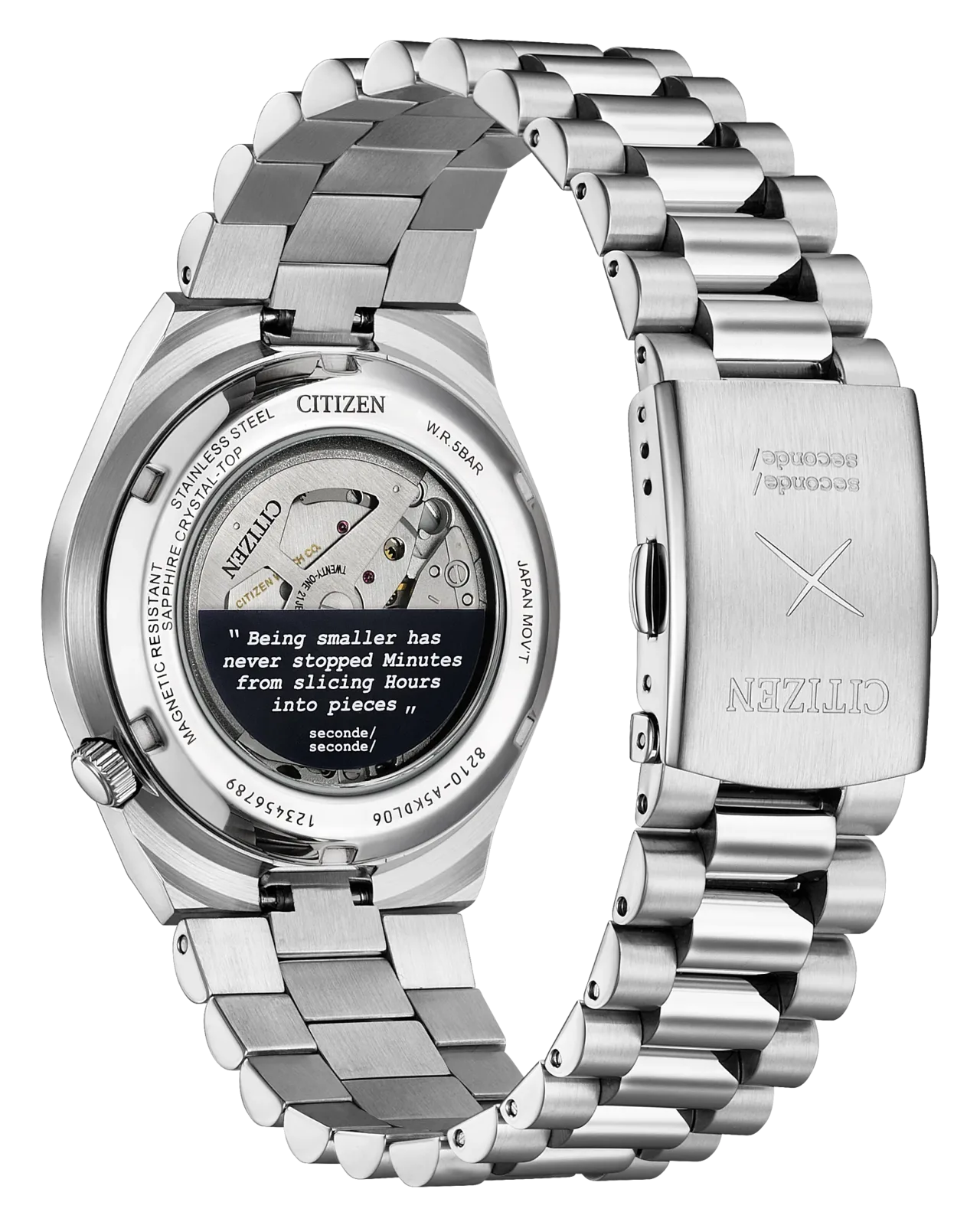 Il tema giocoso si estende anche alla chiusura del bracciale, che reca incisi i segni di "taglio", e al fondello da esposizione, che presenta un messaggio di seconde/seconde/: "Essere più piccoli non ha mai impedito a Minutes di fare a pezzi le ore", spiegando la narrazione del design.