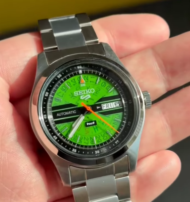 Le immagini hands-on appena avvistate, grazie a @SeikoLeaks su YouTubeci offrono uno sguardo pratico su come il quadrante in acetato "HUF Green" interagisce con la luce. Come previsto, c'è un alto grado di trasparenza che espone le ruote meccaniche del giorno e della data sotto la superficie. L'esecuzione del quadrante, ispirata al "Time Sonar" degli anni '70, crea un effetto stratificato e tridimensionale che non si vede normalmente nella linea Seiko 5 entry-level. Mentre i rendering promozionali spesso igienizzano queste texture, gli scatti fisici rivelano un carattere industriale unico, con la barra orizzontale nera "Automatic" e il logo "huf" a ore 6 che sembrano galleggiare sopra il disco verde.