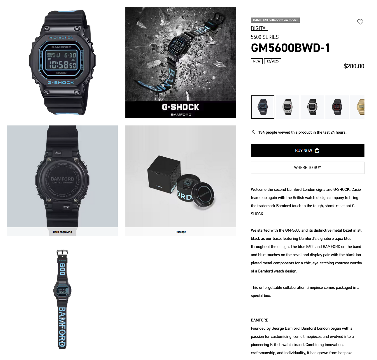 Casio indica il cinturino come una fascia in resina a base biologica, adatta a polsi di dimensioni comprese tra 145 mm e 215 mm. L'orologio utilizza un vetro minerale anziché uno zaffiro. Per gli acquirenti statunitensi, l'orologio è venduto direttamente attraverso il sito web di Casio e viene spedito in una confezione speciale a marchio Bamford. Anche se non si tratta di un'edizione limitata numerata, la disponibilità sembra essere più controllata rispetto alle uscite standard del GM-5600, il che potrebbe far sì che le scorte si spostino in piccoli lotti.