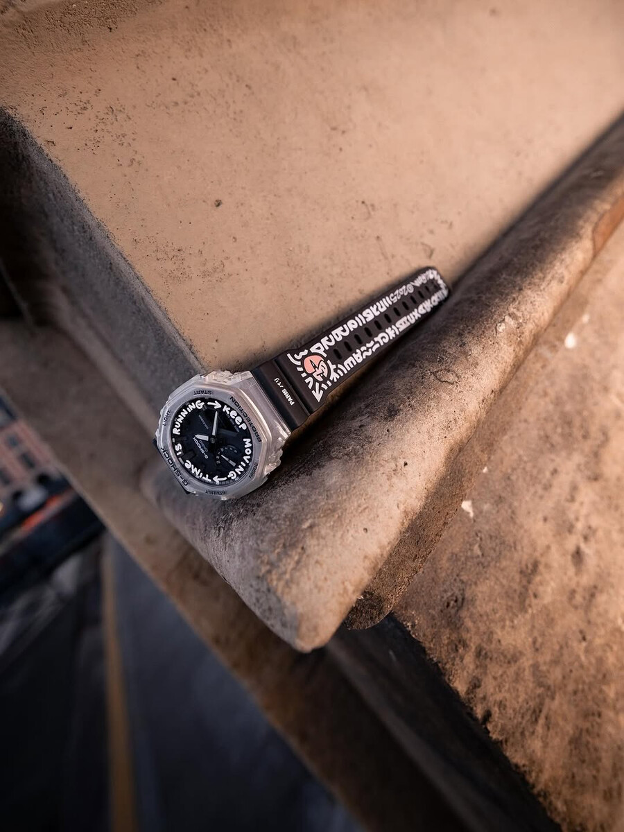 Le immagini della campagna rivelano un orologio ottagonale personalizzato con un look inossidabile e una tipografia audace in stile graffiti. La frase "Time is Running - Keep Moving" circonda la lunetta in tutte le lettere, insieme a disegni luminosi disegnati a mano che corrono lungo il cinturino nero. Ogni angolo, compresi i primi piani delle anse e della fibbia, è in linea con il tema urbano - "Since 1983", "Paris (XI)" e il marchio Lorem "©2025" sono tutti presenti. La confezione - una tradizionale scatola esagonale di G-Shock - è analogamente personalizzata con una grafica in stile gesso e il logo G-Shock davanti e al centro. Gli scatti di lifestyle vedono l'orologio posizionato in un cantiere di Parigi e in contesti di strada.