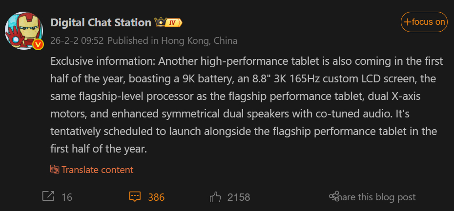 Digital Chat Station, un affidabile informatore di Weibo, ha condiviso un rapporto su un tablet da gioco ad alte prestazioni che dovrebbe essere lanciato nell'H1 (prima metà) del 2026. Secondo quanto riferito, si tratterà di un rivale dell'imminente tab Legion del 2026, di cui Lenovo ha recentemente parlato.