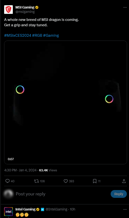 Il poster dell'evento di vendita della console di gioco MSI CLAW non ha fornito alcun dettaglio sulle specifiche. Tuttavia, Intel ha risposto al video teaser ufficiale condiviso da MSI su X (ex Twitter) con tre emoji di facce pensanti. Questa interazione suggerisce che i nuovi Processori Intel Core Ultra potrebbero alimentare l'imminente palmare da gioco.