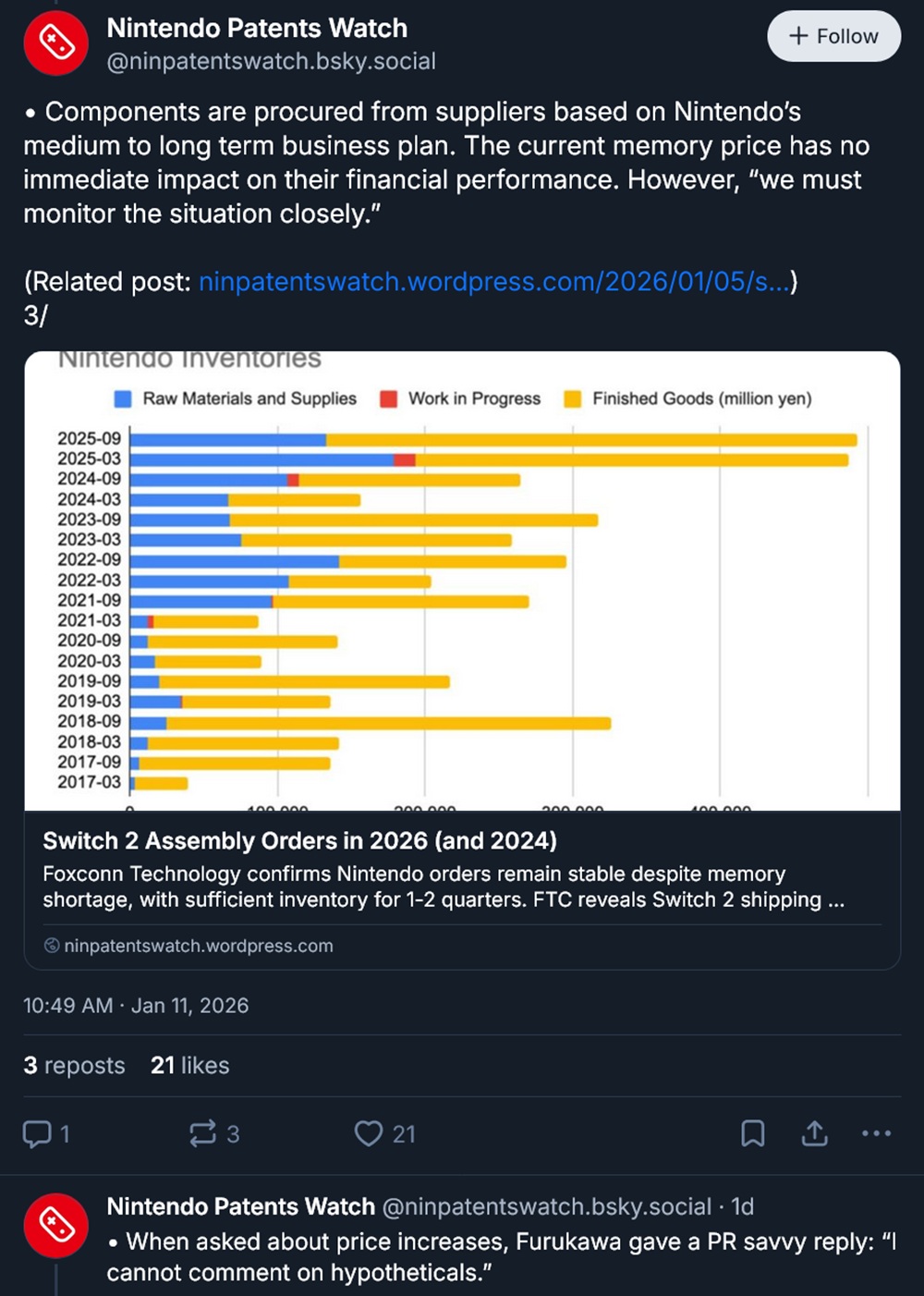 I prezzi della memoria senza precedenti stanno facendo lievitare il costo dei PC da gioco, ma anche le console sono in pericolo. Kyoto Shimbun (paywalled) ha chiesto al Presidente di Nintendo Shuntaro Furukawa in merito ai potenziali effetti sull'ultima console portatile dell'azienda. L'account Patents Watch Bluesky ha tradotto alcuni punti chiave, tra cui una domanda su un aumento del prezzo dello Aumento del prezzo dello Switch 2.