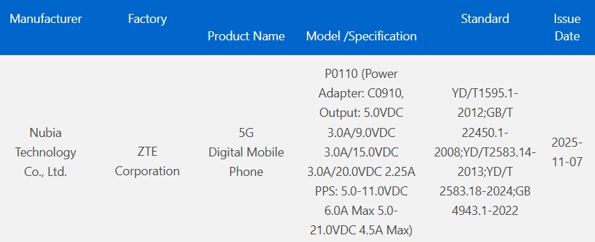 La certificazione 3C dello smartphone, rilasciata di recente, rivela che Nubia P0110 potrebbe essere fornito con un caricabatterie da 94,5, il che significa che è un concorrente di primo piano anche nel reparto di ricarica.