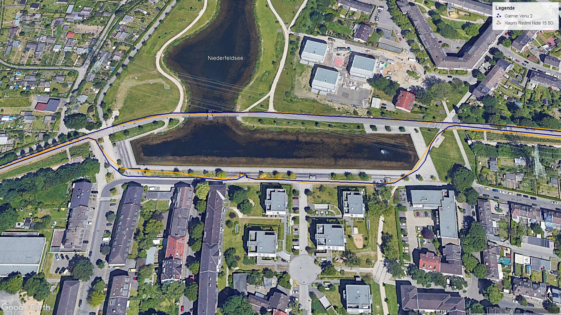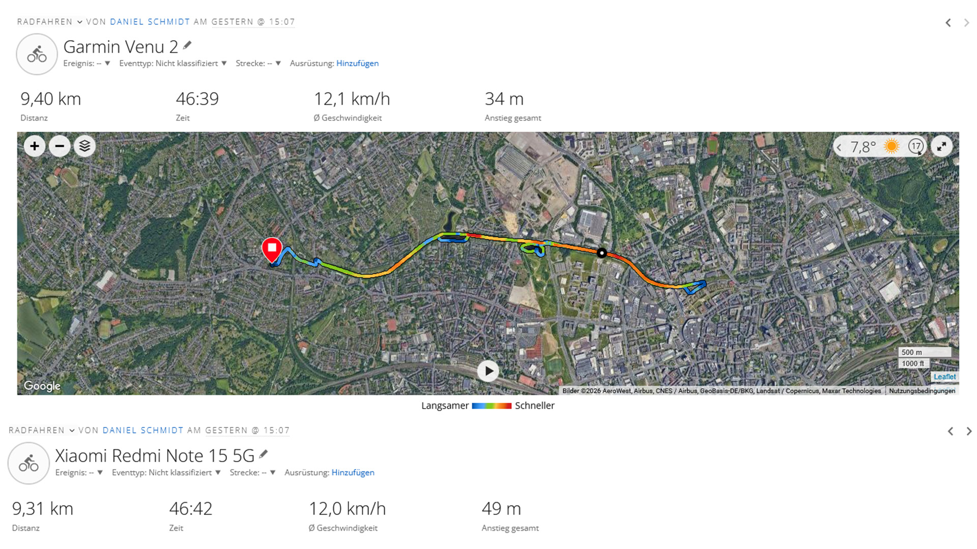 Durante un giro in bicicletta, abbiamo confrontato lo smartphone Xiaomi con uno smartwatch per il fitness di Garmin. Il percorso registrato è per lo più accurato, anche se sono visibili alcune deviazioni dal percorso reale.