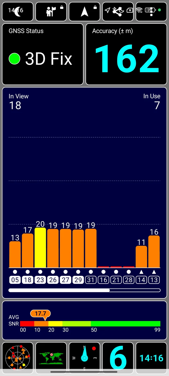 Per il posizionamento è disponibile solo il GNSS a banda singola con quattro sistemi satellitari. Tuttavia, la fissazione dei satelliti all'aperto si ottiene rapidamente e con una buona precisione.