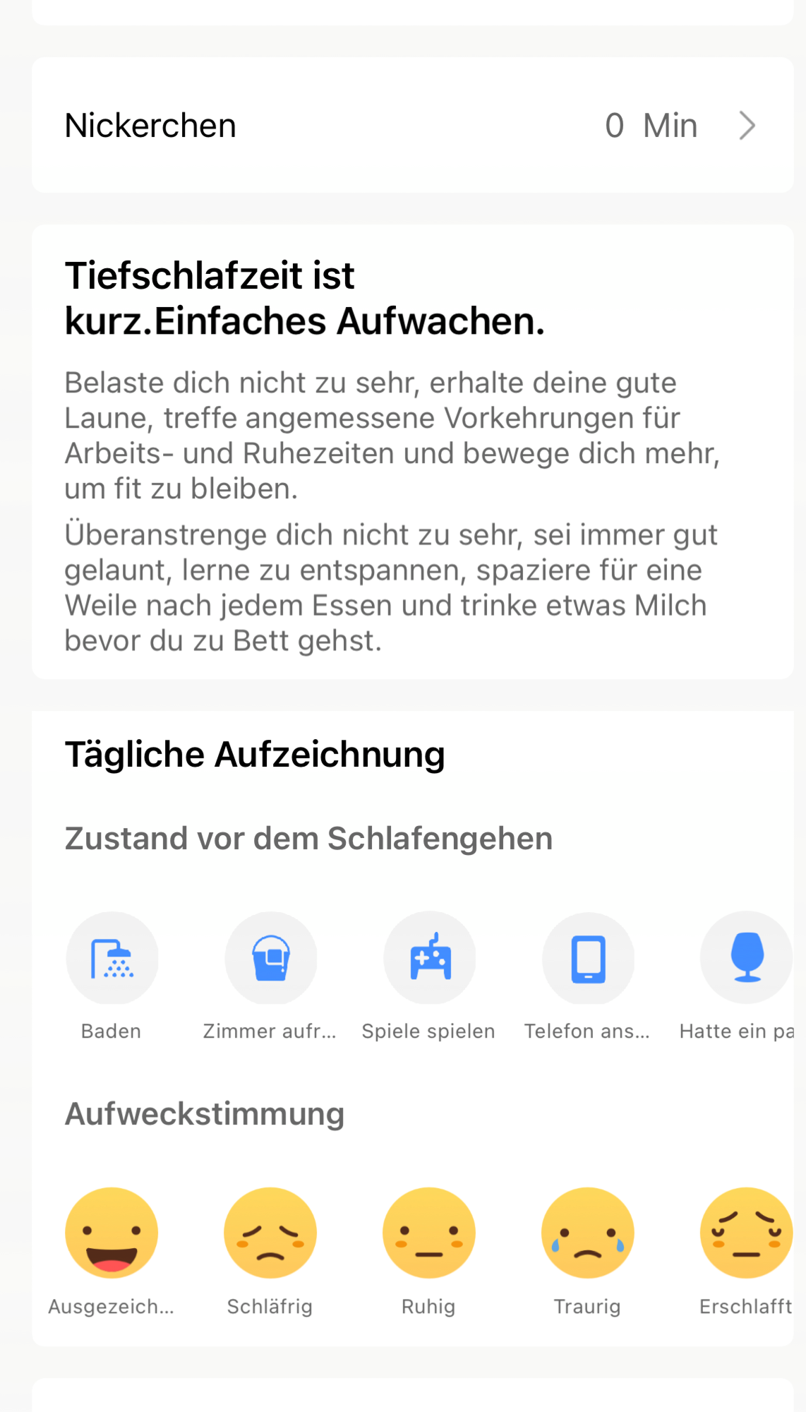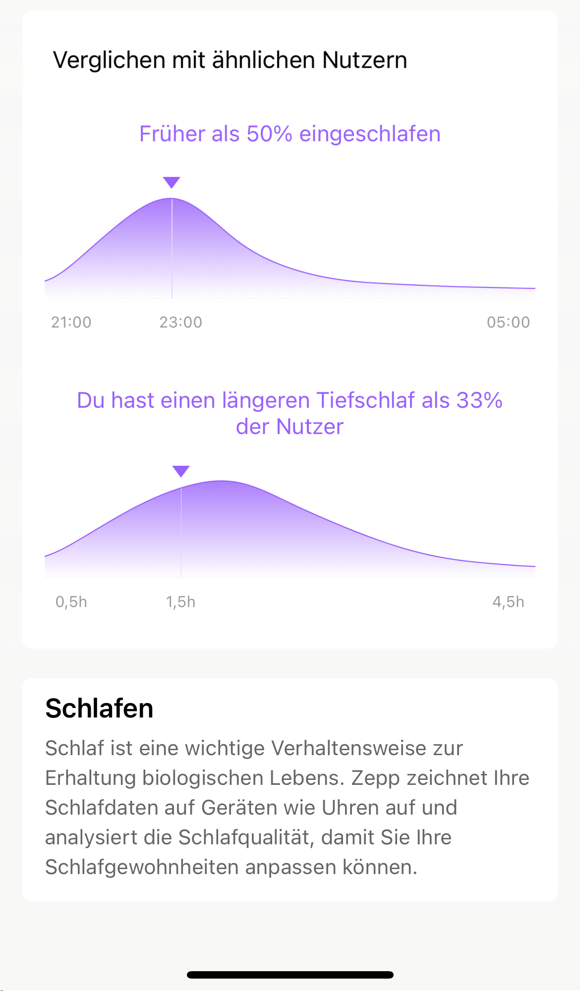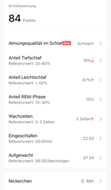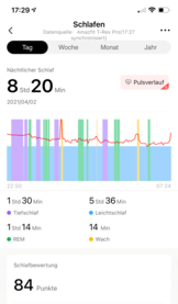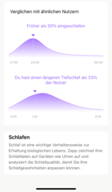 Lo smartwatch Amazfit registra sia il sonno notturno che il pisolino durante il giorno. Il registro del sonno può essere visualizzato solo nell'app. Valuta la qualità del sonno in generale e il rapporto proporzionale delle fasi del sonno. Amazfit integra l'andamento della frequenza cardiaca nella registrazione delle fasi del sonno, ma senza valori numerici.