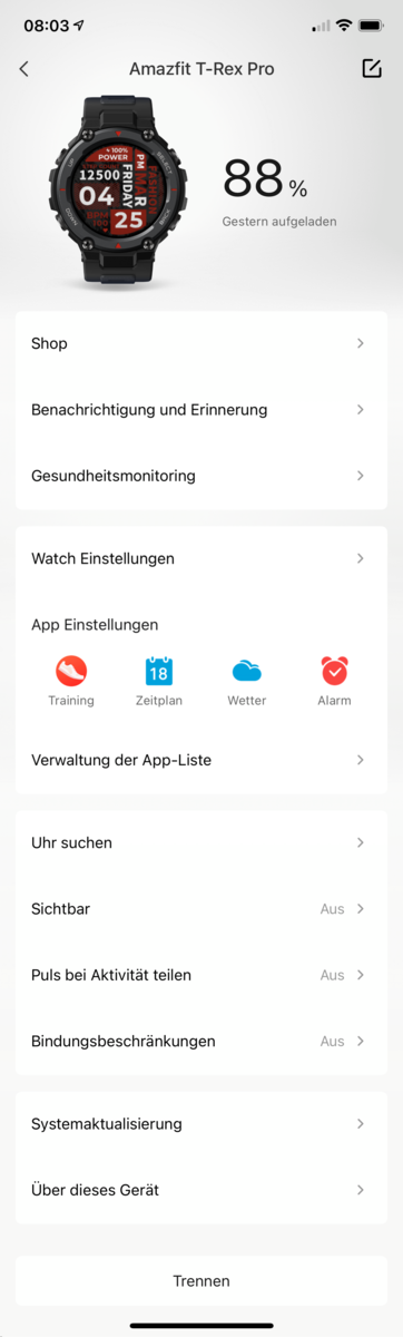 Il T-Rex Pro si collega sia all'iPhone che a uno smartphone Android. Il test è stato eseguito con un iPhone 12 Pro. L'app associata si chiamava Amazfit app e ora si chiama Zepp app. Huami, la società dietro il marchio Amazfit, ha acquistato aree centrali della californiana Zepp International più di due anni fa e sta usando sempre più il suo nome.