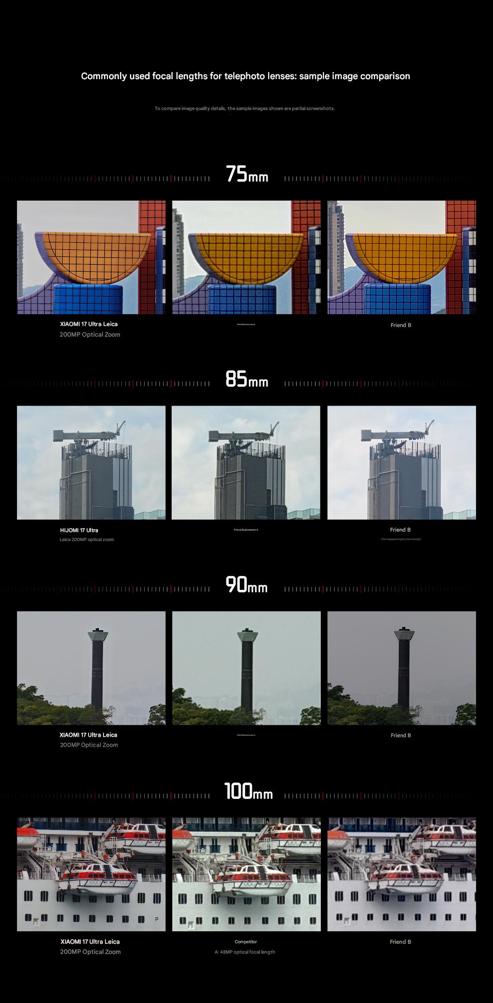 Il marchio ha condiviso alcuni scatti che mostrano i dettagli di cattura in ogni fase della lunghezza focale. Questi scatti, che sono allegati qui sotto, sono anche confrontati con i due telefoni concorrenti senza nome, e sembra che lo Xiaomi 17 Ultra abbia la meglio. Oltre agli scatti di confronto, il marchio ha condiviso alcuni ritratti notturni.