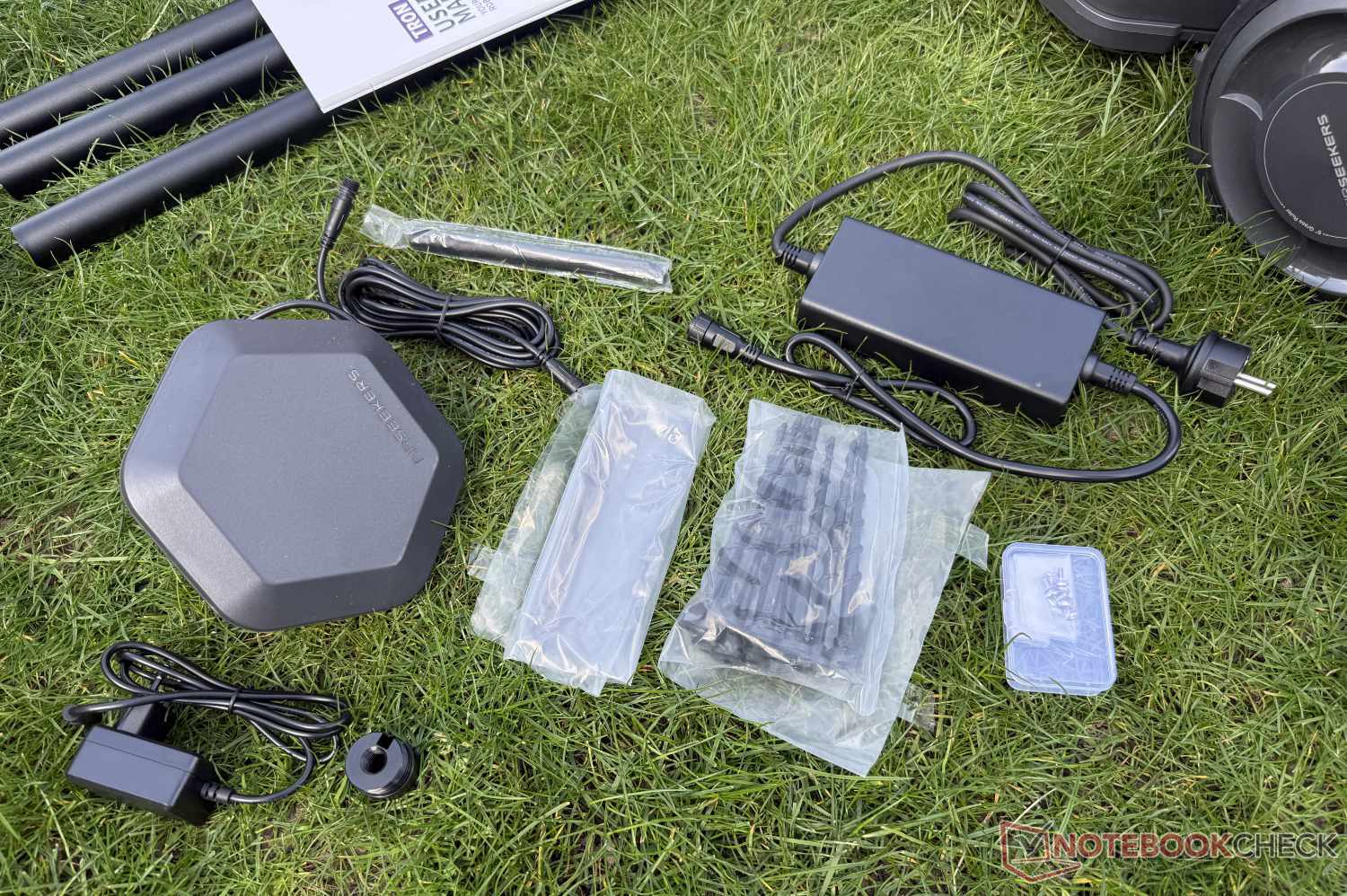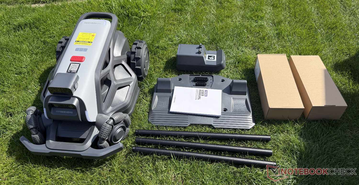 La fornitura comprende molte parti. Oltre al tosaerba robot, la stazione base RTK con tubo in tre parti e picchetto a terra, la stazione di ricarica (che deve ancora essere avvitata), due caricabatterie, sei lame di ricambio, attrezzi e una piastra di protezione sono tutti inclusi nella scatola di 80 x 50 x 45 cm, che pesa 32 kg.
