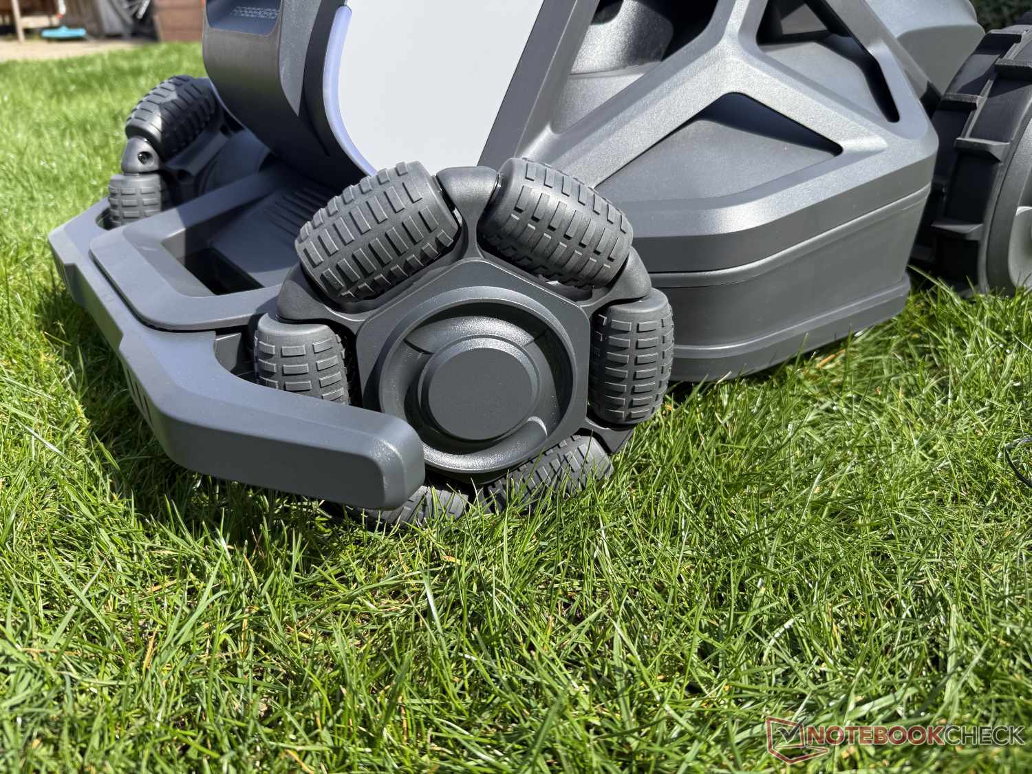 Una spiegazione può essere trovata nelle ruote anteriori, che sono già state criticate in precedenza. Possono ancora funzionare correttamente su un prato perfetto. Tuttavia, se la superficie è un po' irregolare, come probabilmente accade in molti giardini, il tosaerba robotico tende a oscillare avanti e indietro. Questo perché se solo una delle due ruote anteriori ha un buon contatto con il terreno, il Tron sterza automaticamente con una leggera angolazione.