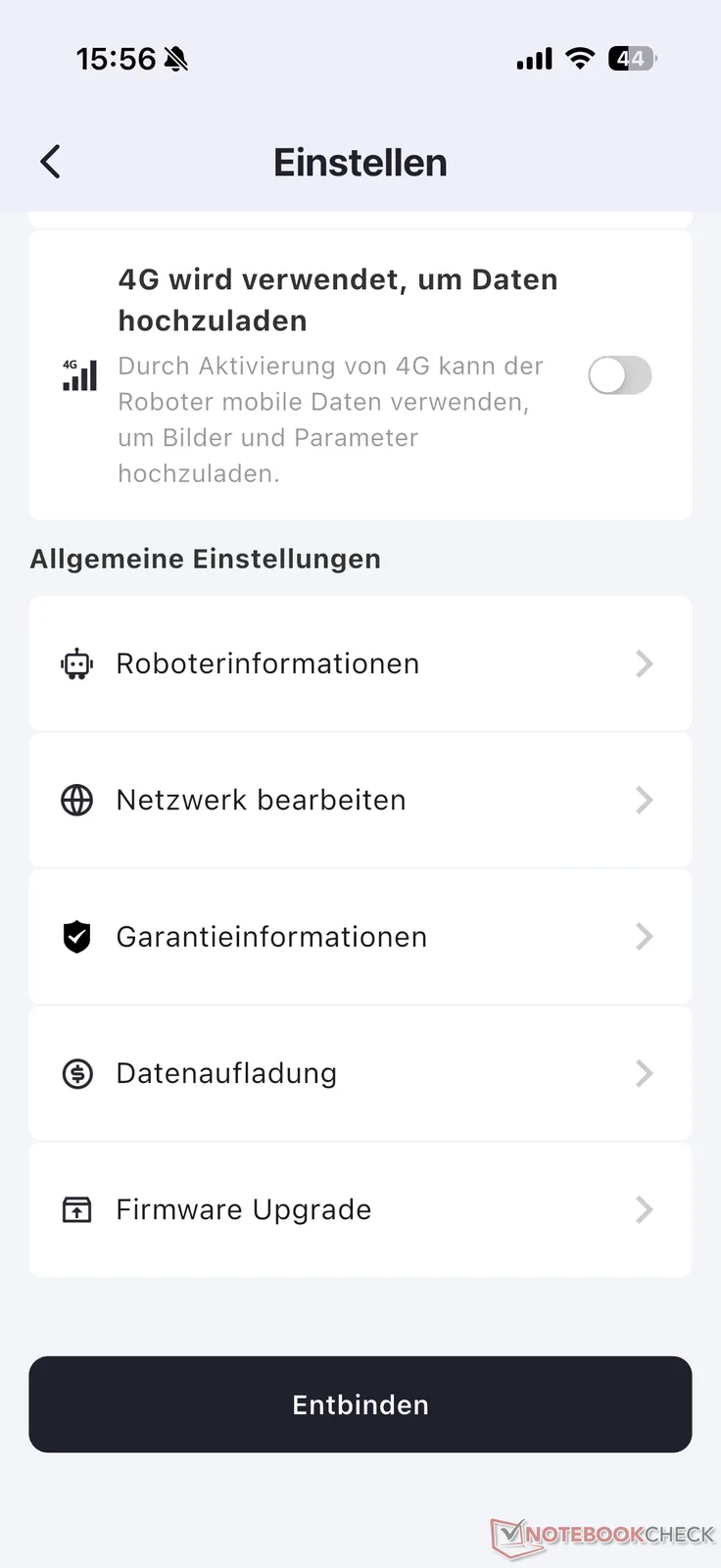In alto a destra, c'è la classica ruota dentata per aprire le impostazioni. Si apre un menu che elenca una selezione rudimentale di opzioni relative a RTK/nRTK, modalità notturna, sequenza di falciatura, attivazione 4G e ricarica dati, nonché aggiornamenti del firmware, oltre a una panoramica del chilometraggio. Non ci sono opzioni per regolare la sensibilità del rilevamento degli ostacoli.