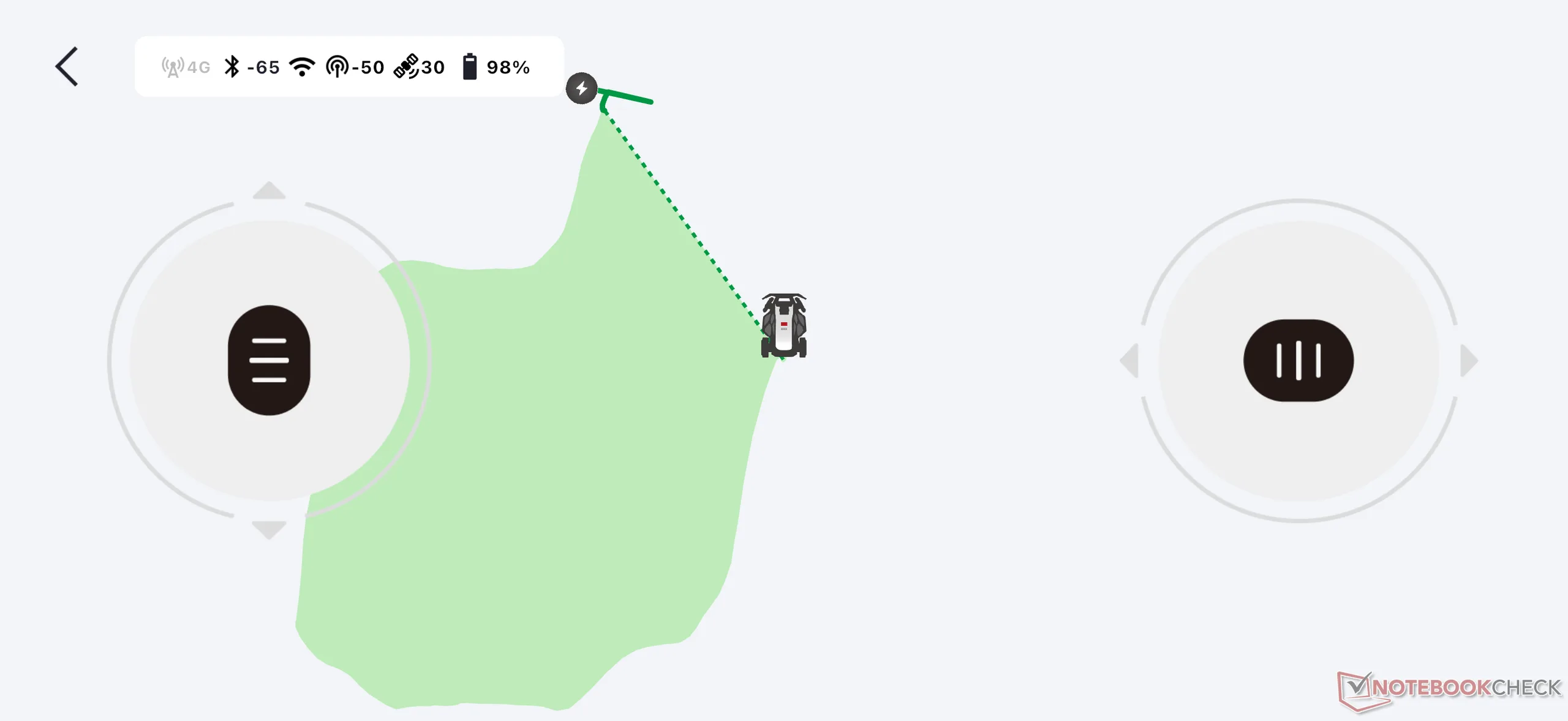 In alto a sinistra, c'è una serie di icone che forniscono informazioni sullo stato attuale di Bluetooth, Wi-Fi, 4G e RTK. Sono disponibili anche lo stato della batteria e la gestione delle mappe, nonché le scorciatoie per le impostazioni di falciatura (compresa l'altezza di taglio) e le attività programmate (per il lavoro automatizzato). Durante la rasatura, può scegliere tra la modalità AI (con ottimizzazione automatica), la rasatura globale, la rasatura dei bordi, la rasatura a zone, la modalità manuale e la modalità di controllo remoto.