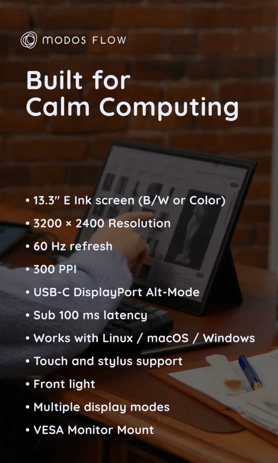 Modos ha già lanciato un display e-ink mobile sul mercato l'anno scorso, ma Modos Flow offre caratteristiche di gran lunga migliori. Innanzitutto, il nuovo monitor mobile e-ink con una diagonale di 13,3 pollici raggiunge una risoluzione significativamente più elevata di 3.200 x 2.400 pixel con una densità di pixel di 300 PPI.
