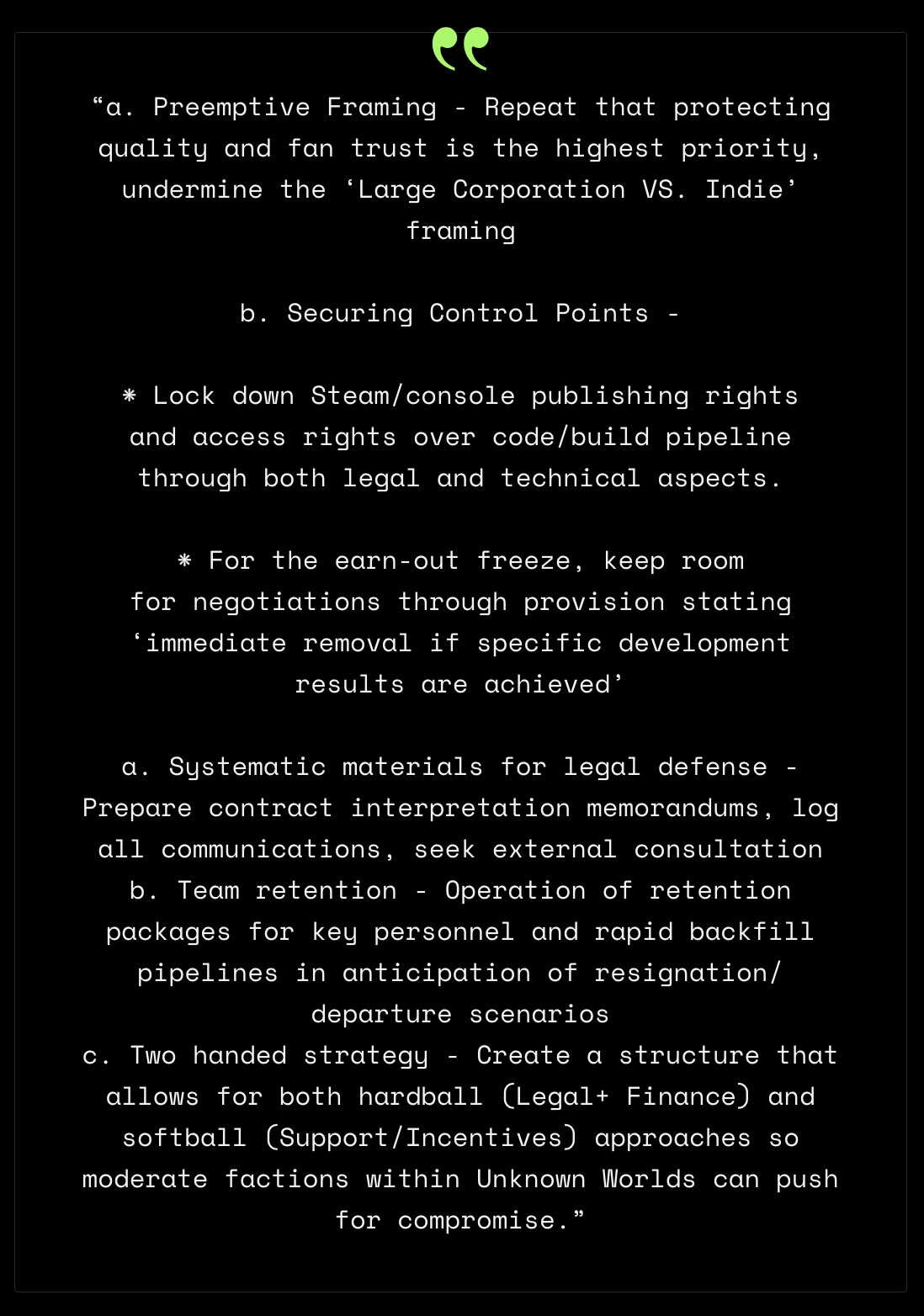 I documenti precedenti facevano riferimento anche a discussioni interne sulla riduzione dei pagamenti proposti, oltre ad avvertimenti dall'interno di Krafton che il licenziamento della leadership avrebbe comportato rischi legali.