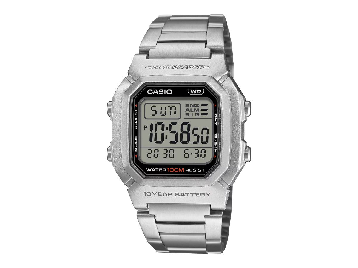 Al centro del W-800HD-1AV si trova un display digitale con uno sfondo chiaro. Qui gli utenti possono visualizzare l'ora, la data e il giorno della settimana. Questo modello supporta il doppio fuso orario, il che significa che può passare rapidamente da una preimpostazione all'altra. Offre anche strumenti come un cronometro a 1/100 di secondo, segnali orari e una sveglia multifunzionale con funzione snooze. Una retroilluminazione a LED verde può illuminare il display, in modo da poterlo leggere facilmente di notte. Casio pubblicizza questo orologio come resistente all'acqua fino a 100 m e funzionante per circa 10 anni con la batteria CR2025.